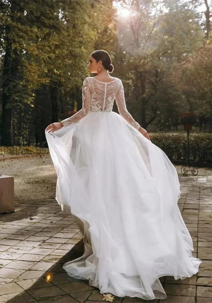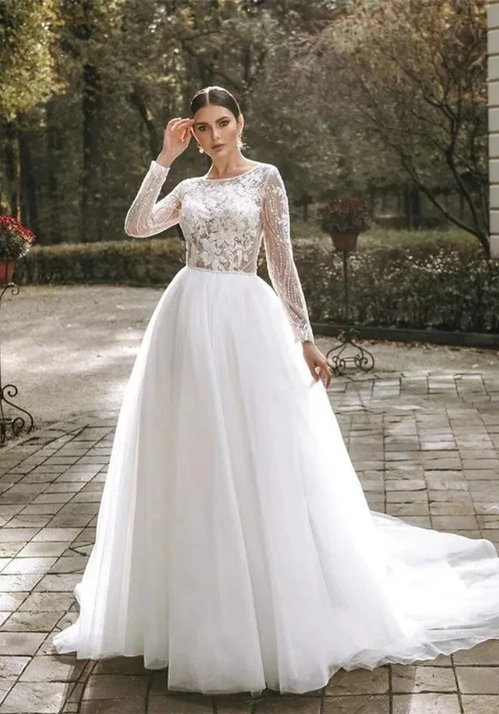 Cette robe de mariée d’hiver à manches longues conjugue élégance et féerie, avec son bustier en dentelle brodée et sa jupe en tulle blanc.
