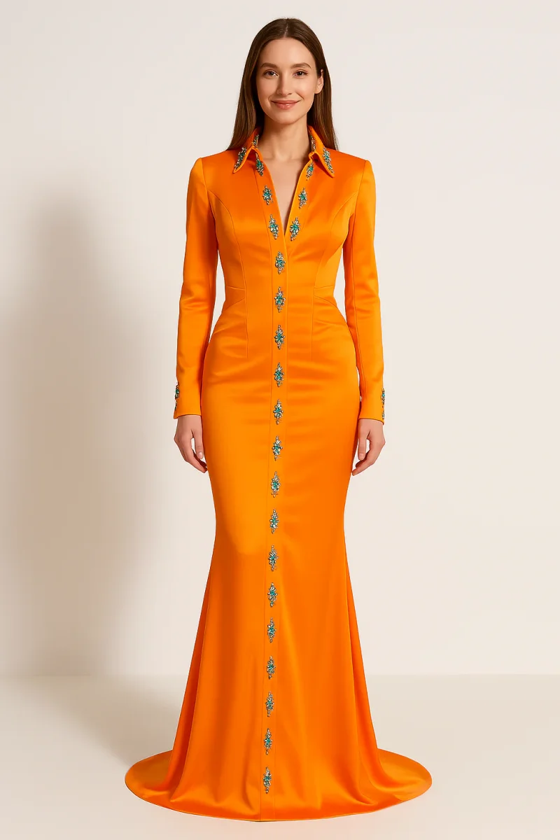 Faites sensation lors de votre prochain événement avec notre sublime robe orange brûlée. Sa couleur chaude et vibrante captera tous les regards avec son corsage orné de broderies turquoise. La coupe sirène épouse parfaitement vos courbes pour une silhouette à couper le souffle, tandis que le dos échancré ajoute une touche sensuelle tout en conservant une élégance raffinée. Idéale pour un mariage ou une soirée de gala.
