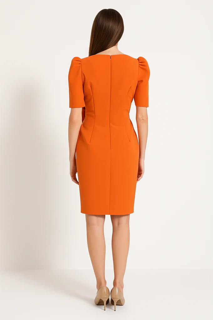 Captivez tous les regards avec cette robe orange qui allie élégance et originalité. Sa couleur vibrante illuminera votre silhouette tandis que son design unique avec volants façonnés en forme de rose apporte une touche de sophistication. La coupe ajustée met en valeur vos courbes, complétée par des manches courtes bouffantes et un décolleté en V flatteur. Sa longueur au genou vous permet de la porter pour diverses occasions tout en restant élégante.