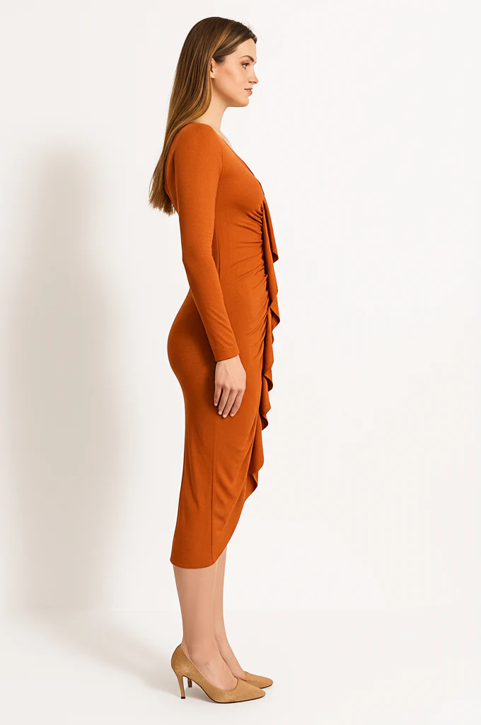 Découvrez cette robe orange moulante au style raffiné qui met en valeur vos courbes naturelles grâce à son tissu jersey extensible de qualité supérieure. Son détail volant central apporte une touche sophistiquée et structure la silhouette, créant un effet d’affinement. Le décolleté en V flatteur et sa longueur midi tendance s’adaptent parfaitement à toutes les morphologies, pour un look aussi confortable que stylé.