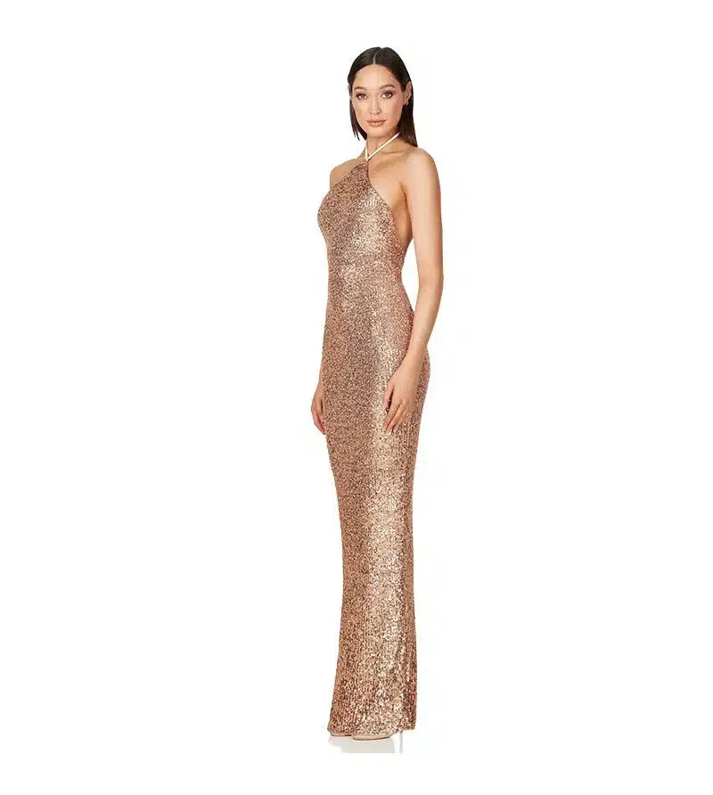 Laissez-vous séduire par cette robe longue moulante entièrement recouverte de paillettes dorées qui scintillent à chaque mouvement. Son col licou élégant met en valeur vos épaules, tandis que sa coupe près du corps sublime votre silhouette. Le dos nu sensuel apporte une touche de séduction sophistiquée, parfaitement équilibrée par la fente latérale qui confère liberté de mouvement et élégance à votre démarche.