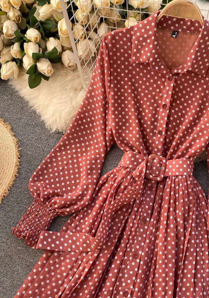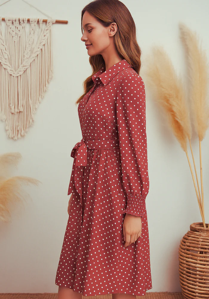 Détails : col chemise, ceinture à nouer assortie, pois blancs sur fond terracotta