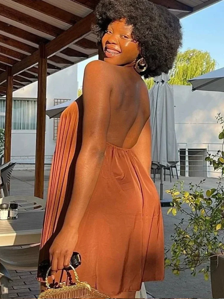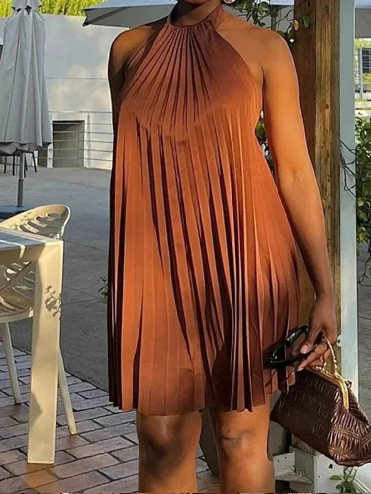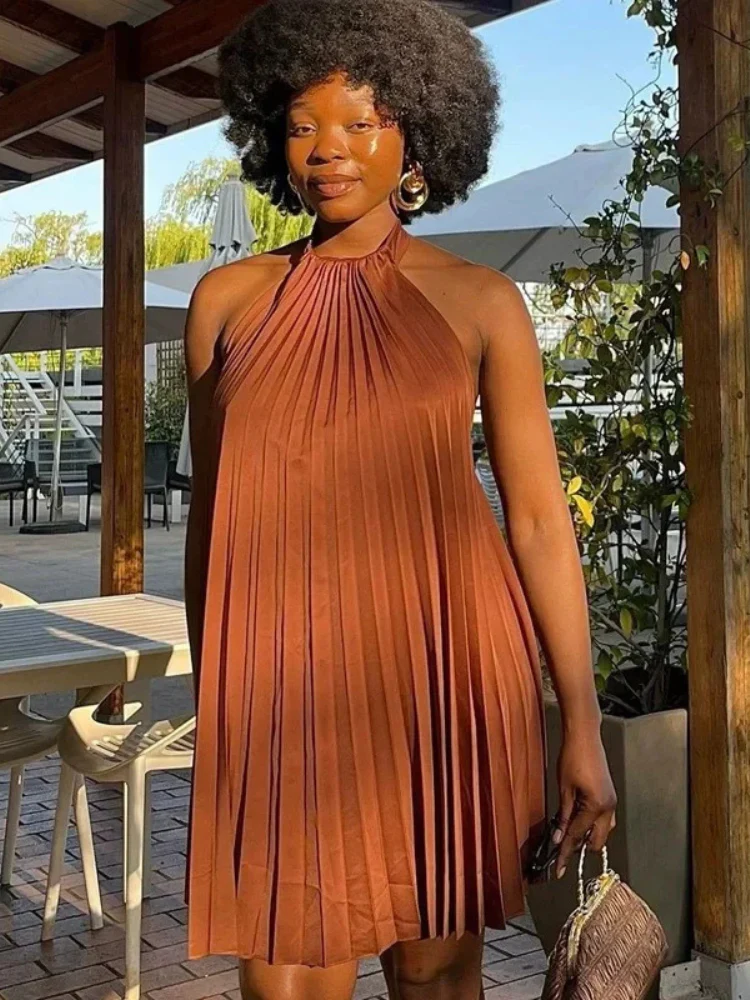 Cette robe évasée se distingue par son col halter et son magnifique tissu plissé qui crée un mouvement naturel à chaque pas. Sa coupe confortable et aérienne en fait un choix idéal pour un look chic sans effort, du brunch jusqu’à la soirée.