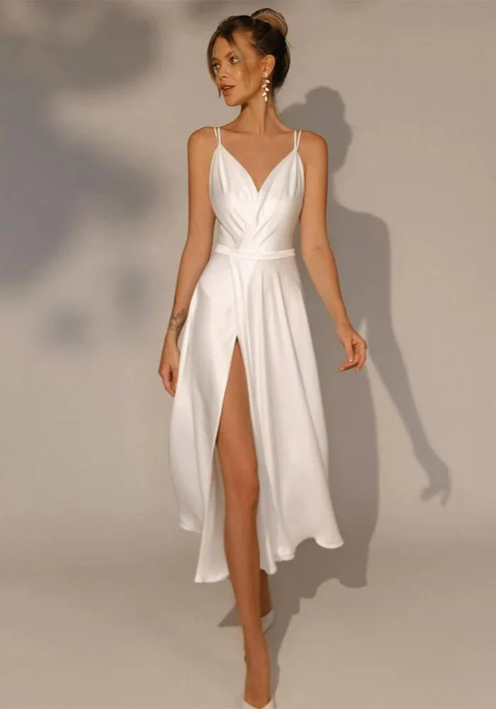 Cette robe capture la magie de votre grand jour à travers une longueur mi-mollet idéale, vous offrant à la fois confort et sophistication. Le décolleté en V et les bretelles fines viennent dessiner délicatement votre silhouette, tandis que la jupe fluide avec sa fente haute laisse entrevoir vos jambes avec élégance. La taille cintrée met en valeur votre forme, promettant une allure des plus raffinées.