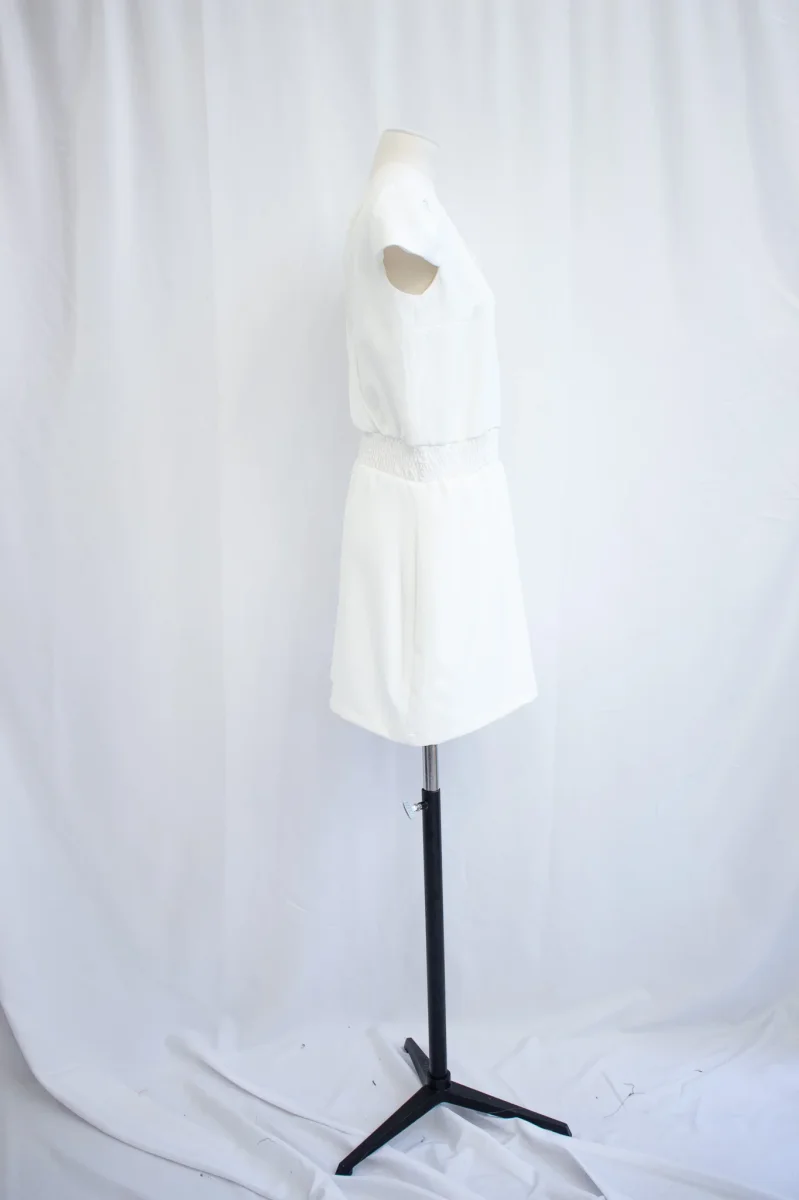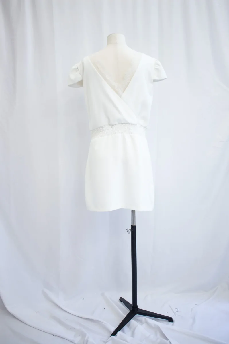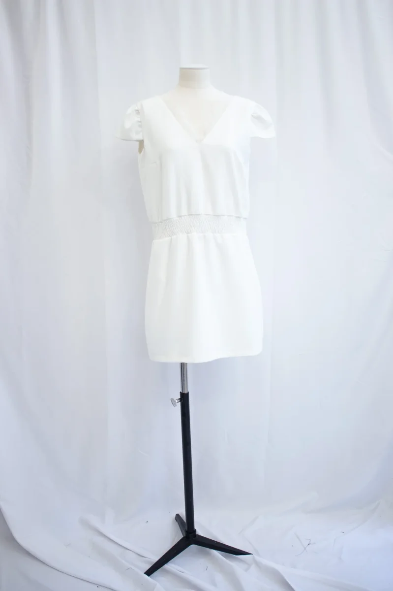 Fabriqué en France ⬇ message alerte ⬇ Attention ! La vente privée se déroule exclusivement en ligne. Aucun essayage n’est possible au showroom. Description Détails : Robe courte taille empire ceinture smockée, col V devant et dos nu. Matières : – Polyester Couleurs : – Blanc Conseils D’entretien Livraison et Retours
