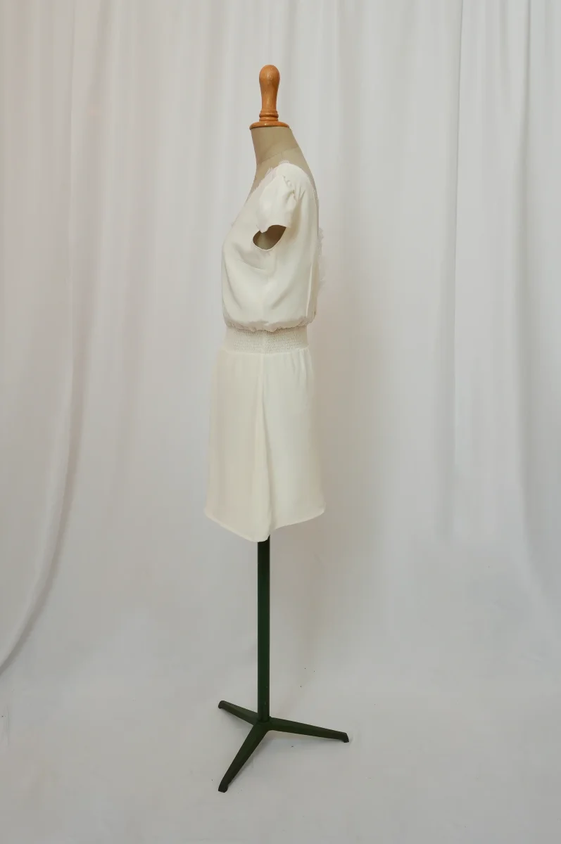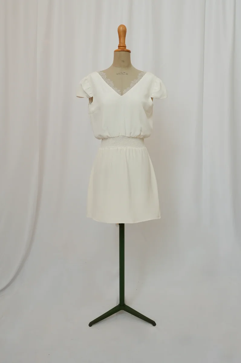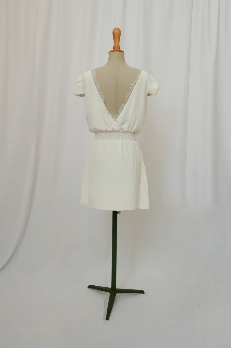 Fabriqué en France ⬇ message alerte ⬇ Attention ! La vente privée se déroule exclusivement en ligne. Aucun essayage n’est possible au showroom. Description Matières : soie et dentelle Couleurs : Blanc Conseils D’entretien Livraison et Retours