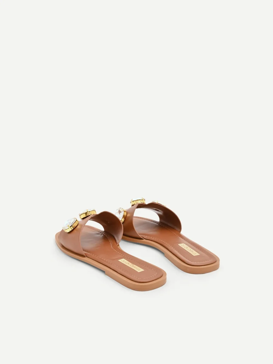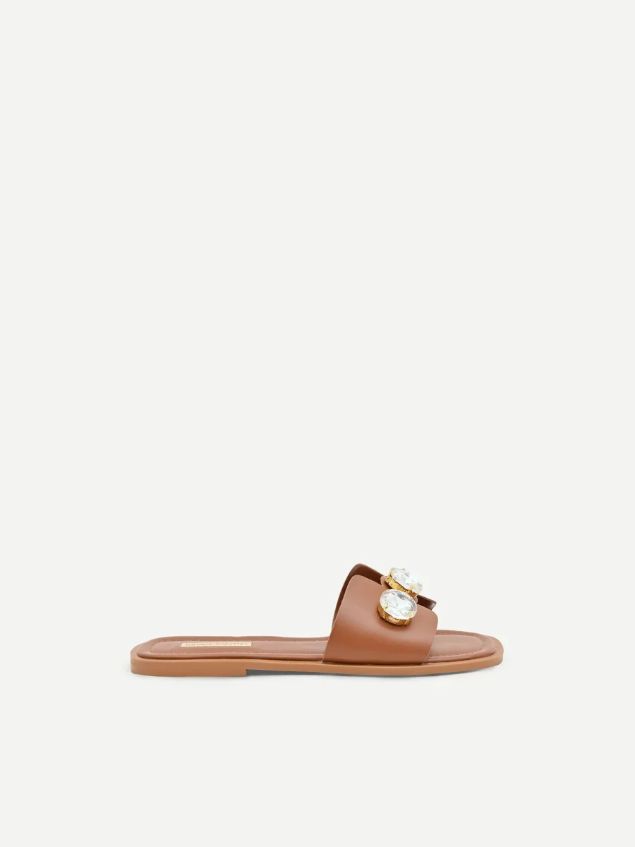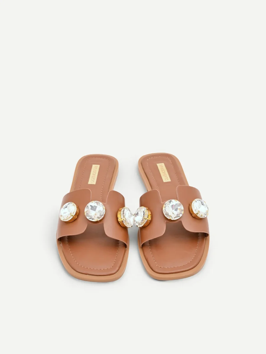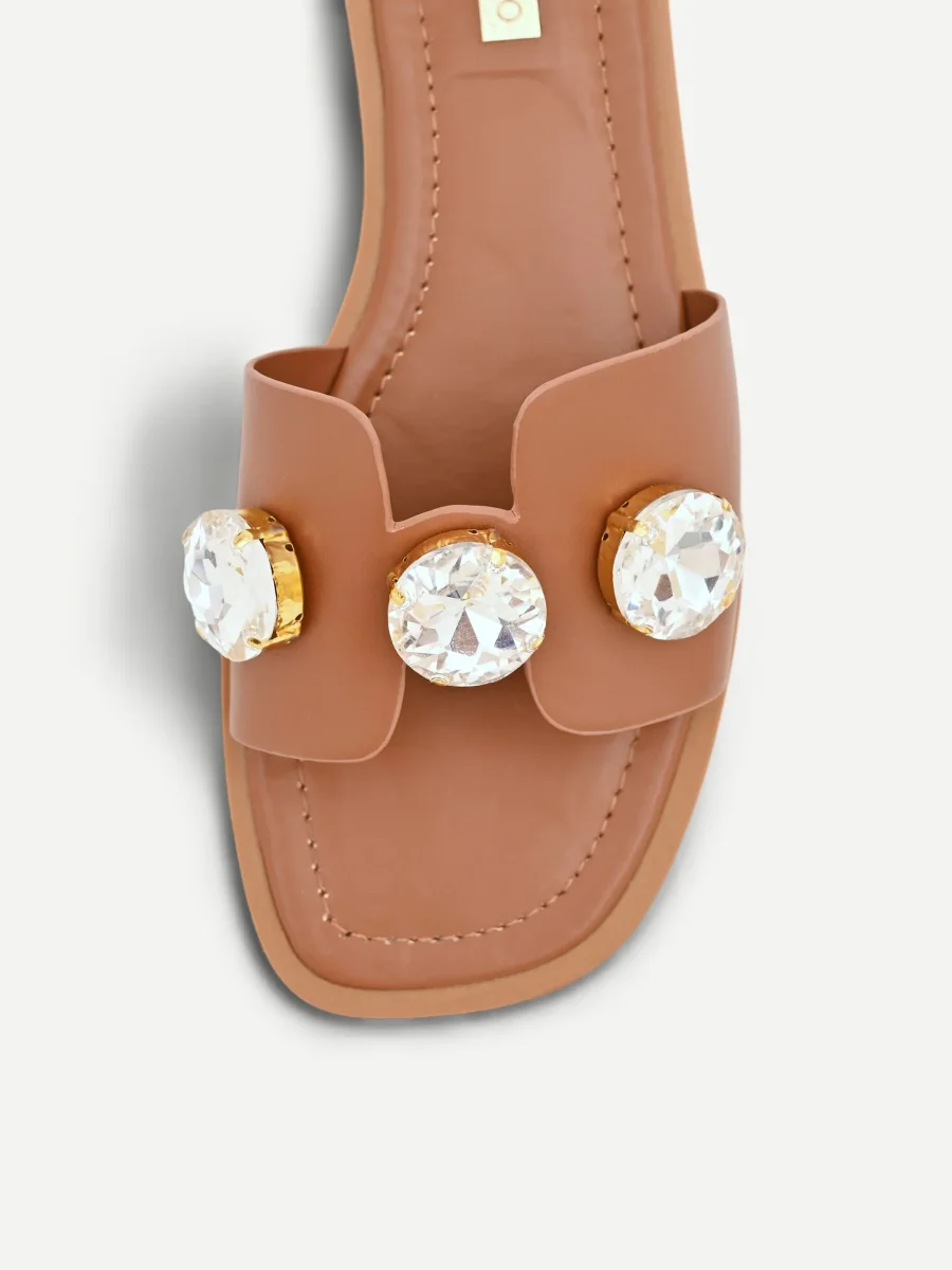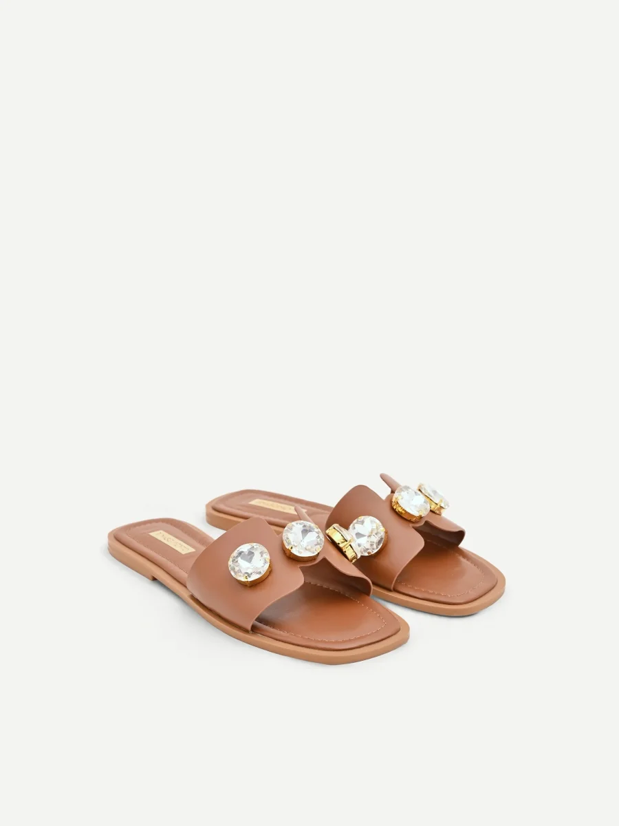 Un intreccio di similpelle e bagliori definisce il carattere di questi sandali effetto cuoio, un accessorio pensato per completare con un tocco ricercato ogni look. La sua unicità risiede nel dialogo tra materiali diversi: la tomaia è realizzata in un tessuto effetto pelle dal pattern liscio, su cui sono applicate pietre XL che catturano la luce a ogni movimento. La silhouette, femminile e contemporanea, è caratterizzata dalla punta squadrata .Questa calzatura è perfetta per look estivi casual e per il tempo libero.