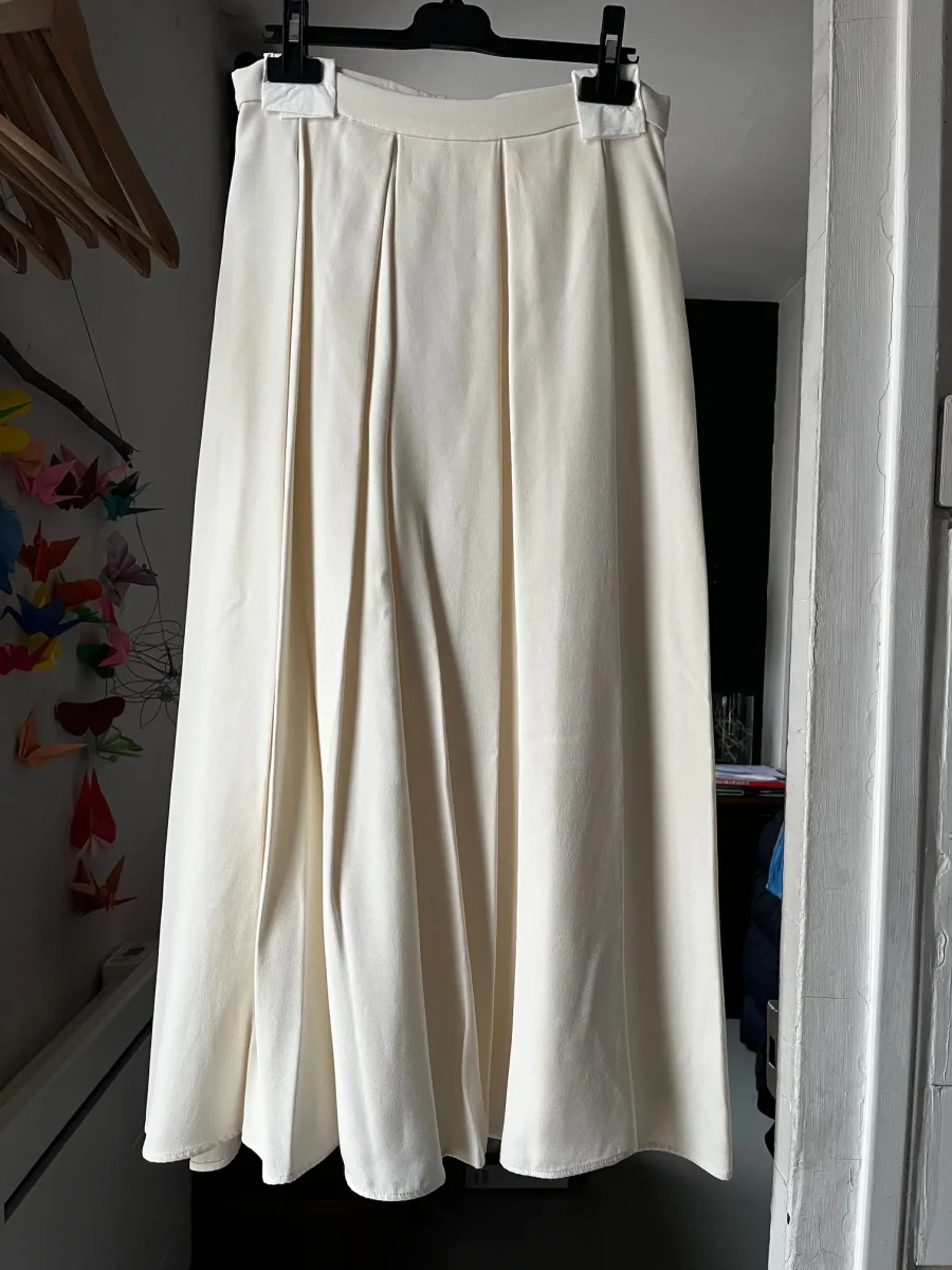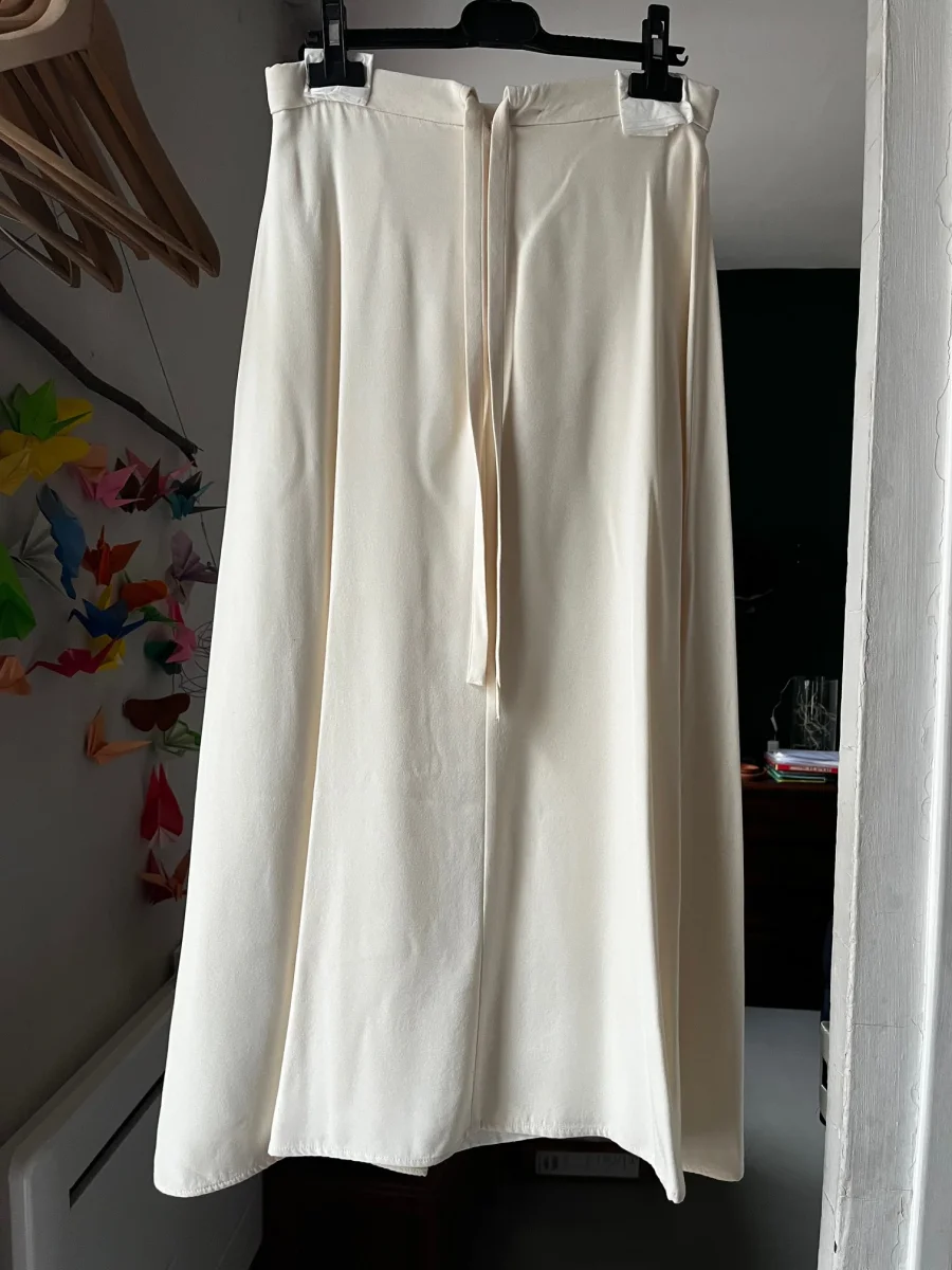 Jupe de L’Intemporelle en soie couleur ivoire. Alliant finesse des matières et allure poétique, offrant une silhouette raffinée et intemporelle, parfaite pour une cérémonie ou un événement élégant.