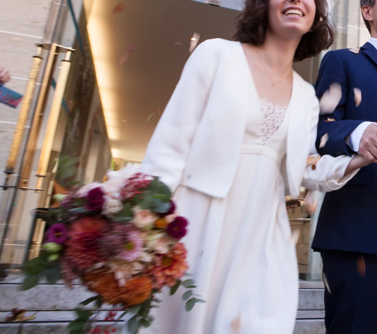 Son dos nu délicatement dévoilé apporte une touche de féminité assumée, tandis que les petites manches en dentelle de Calais encadrent l’épaule avec subtilité.