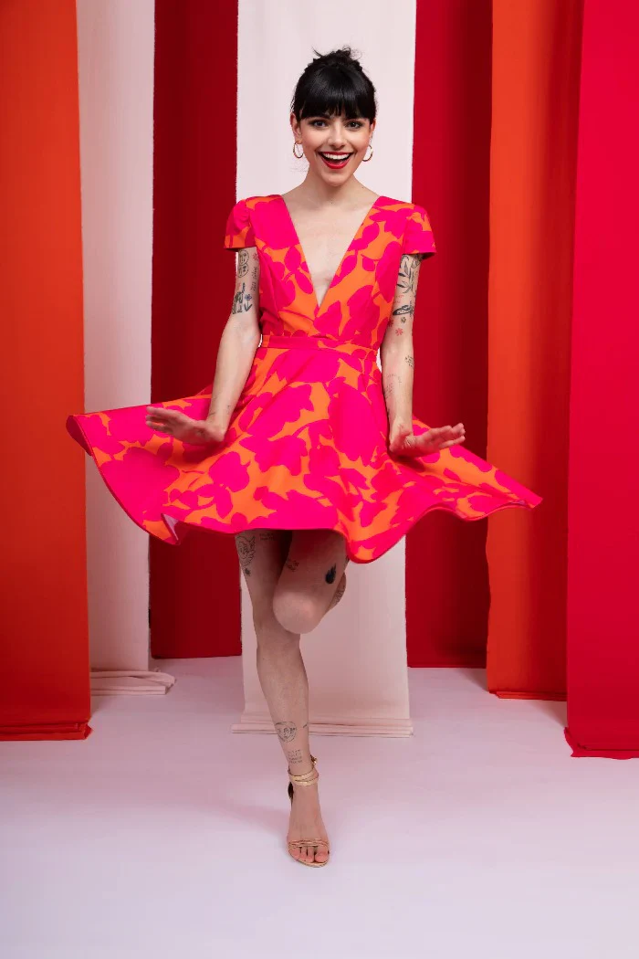 Décolleté croisé profond à l’avant et décolleté dos profond.