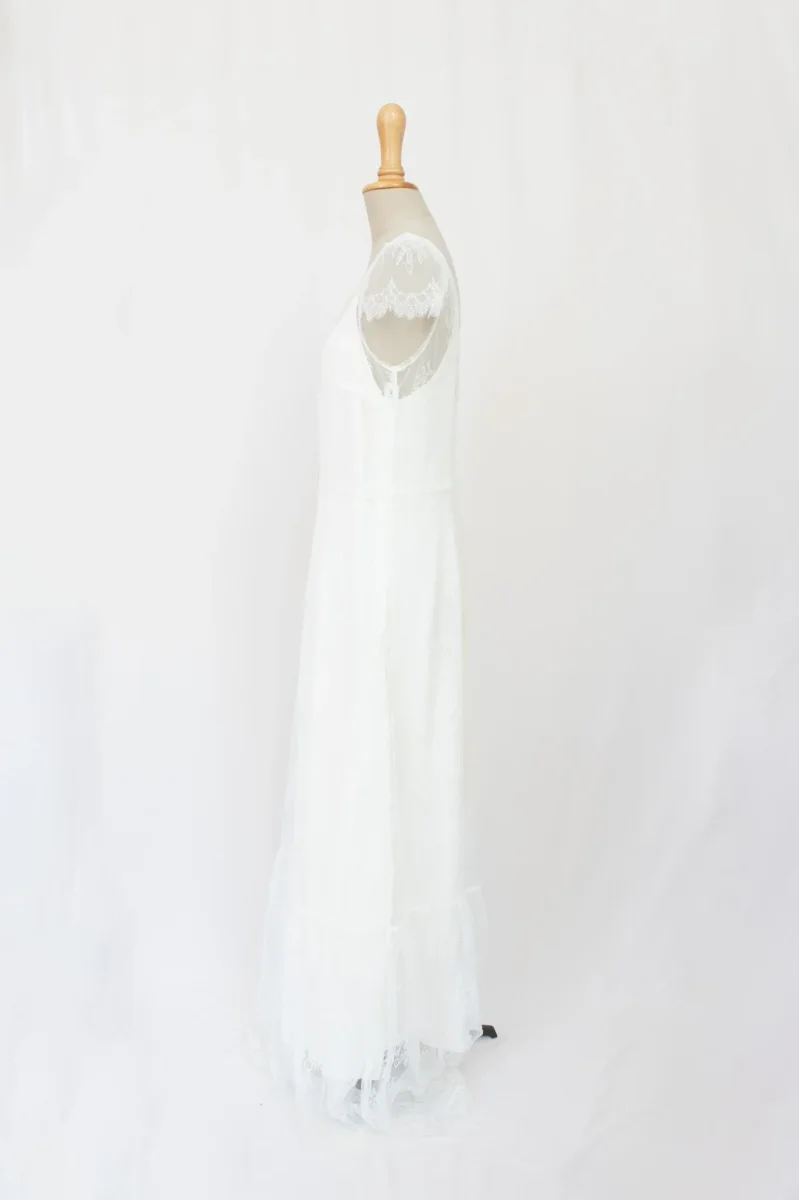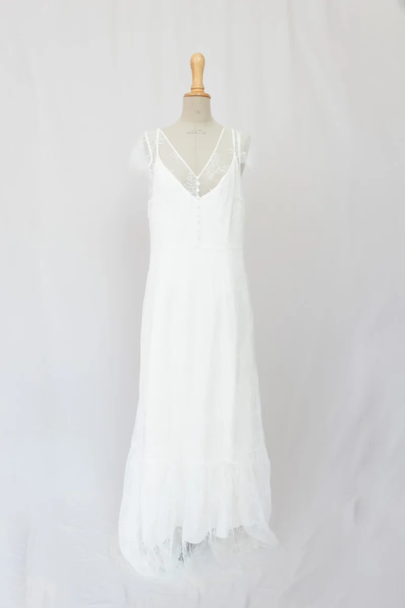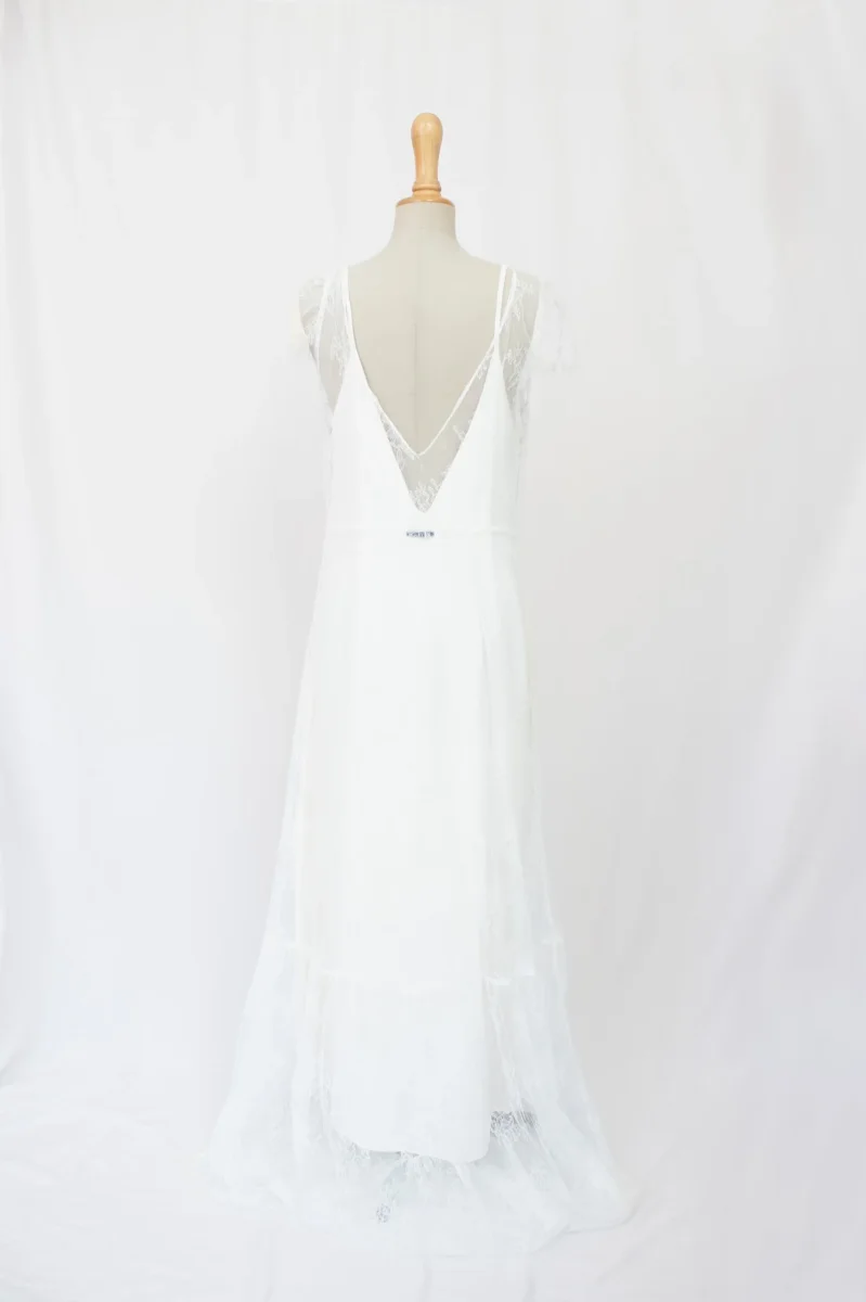 Jolie robe de mariée en soie et dentelle qui allie élégance et sensualité. Son décolleté en V, rehaussé de boutons délicats, est encadré par de fines bretelles en dentelle. La jupe fluide en soie, subtilement doublée de dentelle, crée une allure romantique et légère. Le dos en V profond ajoute une touche de sophistication, tandis que la traîne délicate apporte une note de grâce.