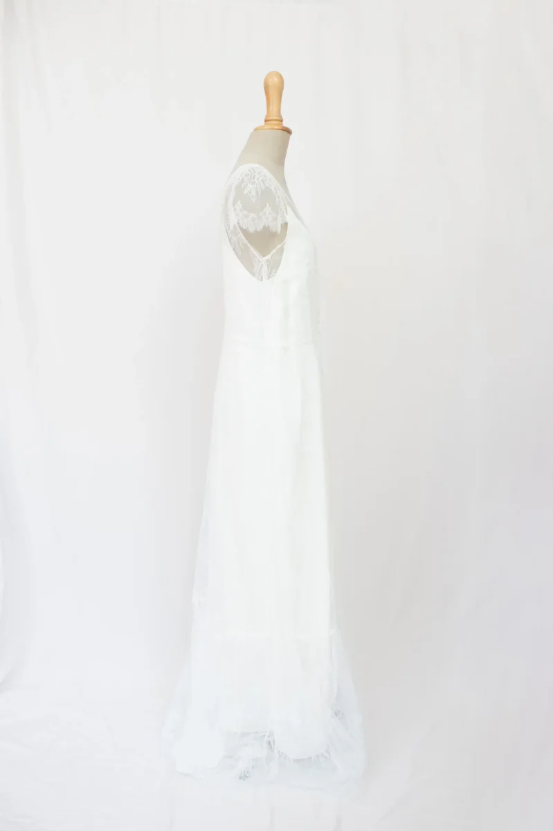 Description Jolie robe de mariée en soie et dentelle qui allie élégance et sensualité. Son décolleté en V, rehaussé de boutons délicats, est encadré par de fines bretelles en dentelle. La jupe fluide en soie, subtilement doublée de dentelle, crée une allure romantique et légère. Le dos en V profond ajoute une touche de sophistication, […]