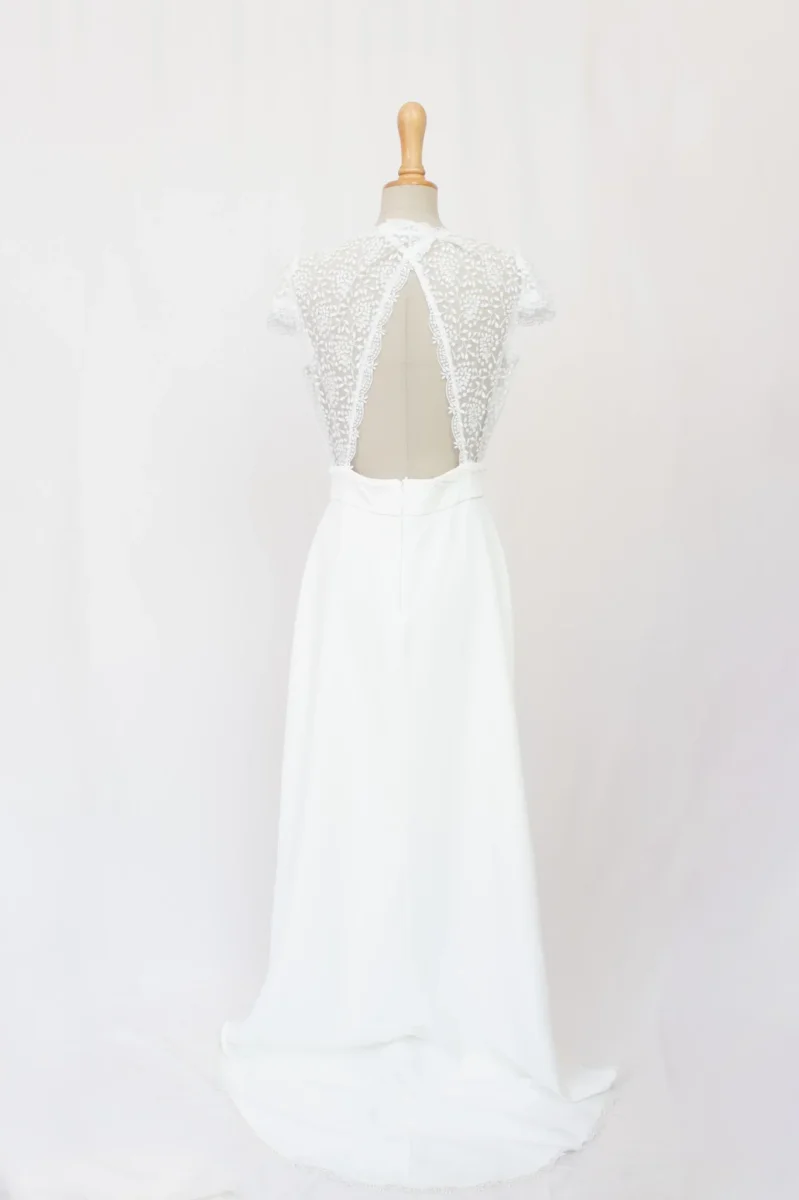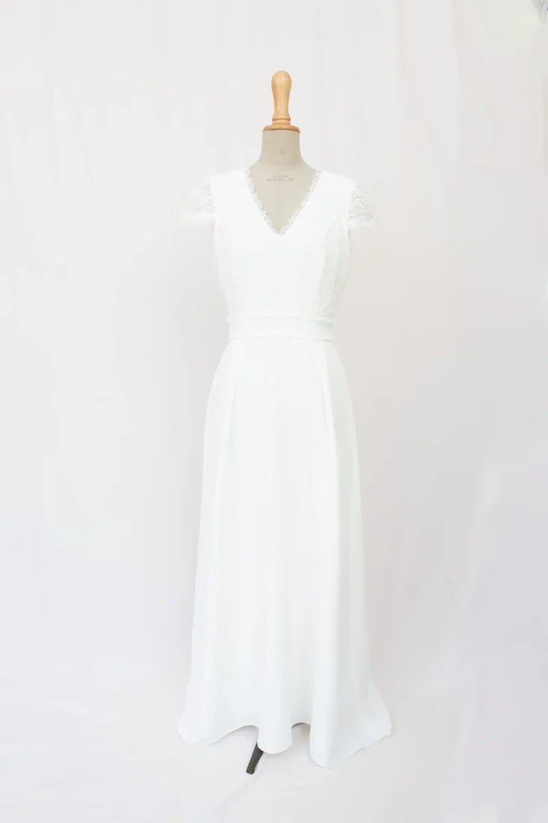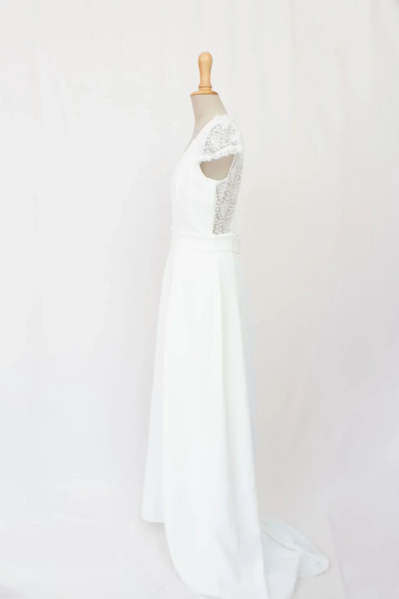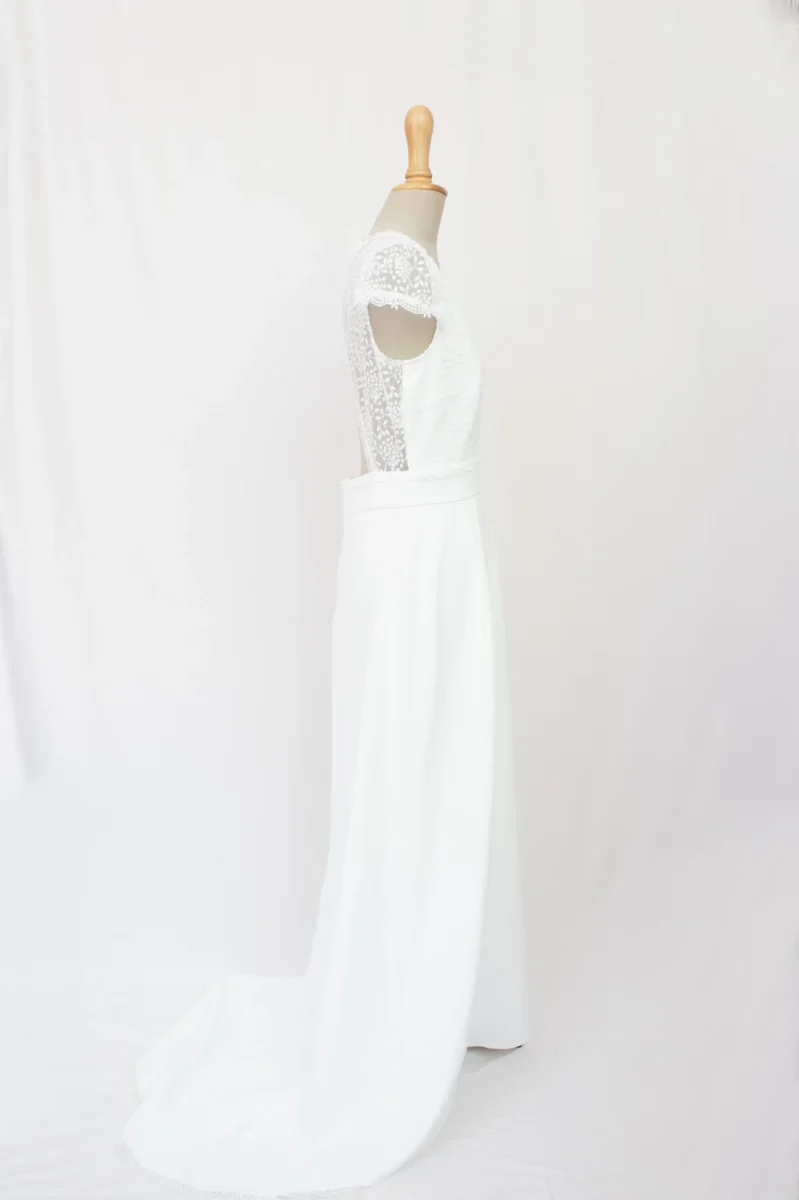 Découvrez cette robe de mariée en polyester et dentelle alliant élégance et modernité. Avec son décolleté en V bordé de dentelle, ses manches courtes raffinées, et sa ceinture qui souligne délicatement la taille, cette robe offre une silhouette gracieuse. Le dos ouvert en dentelle ajoute une touche de sophistication, tandis que la jupe fluide et sa légère traîne apportent une note majestueuse.