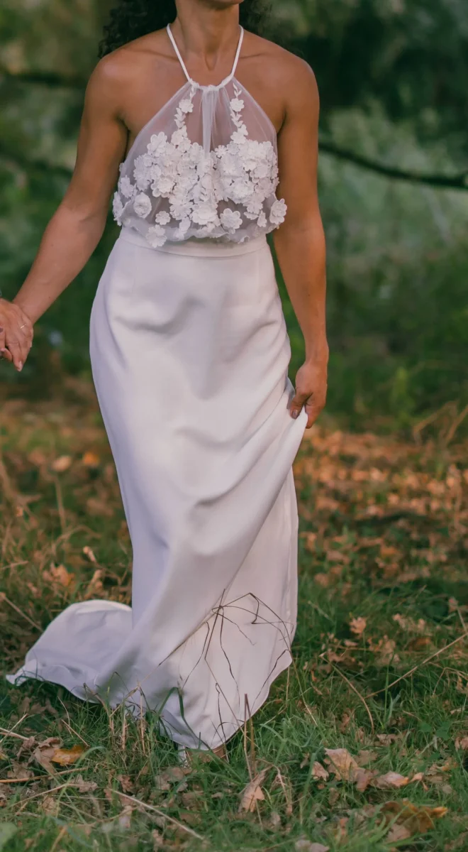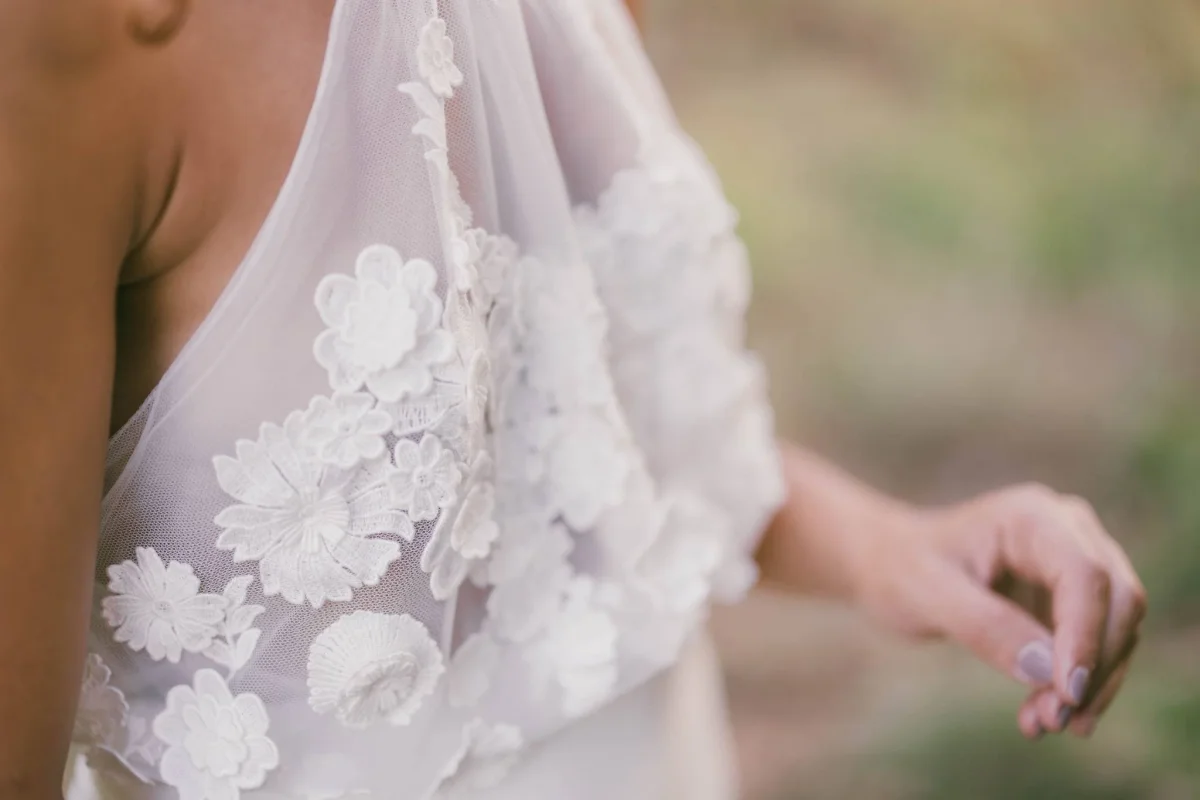 Son top en tulle brodé à la main de fleurs en dentelle offre un jeu de transparence délicat,