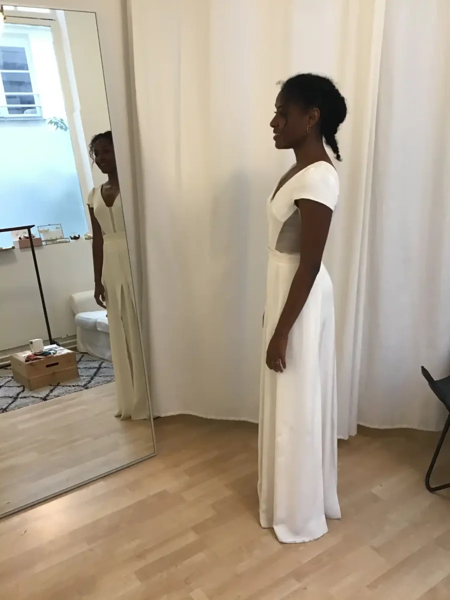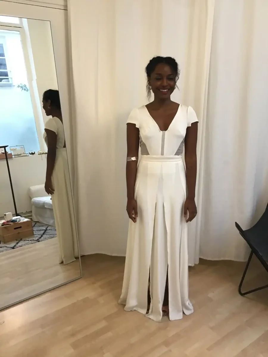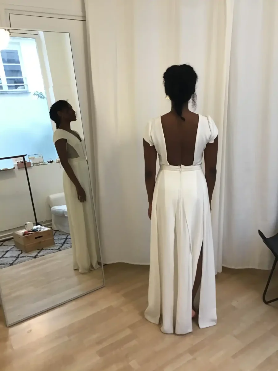 Le résultat : une robe de mariée chic au dos nu spectaculaire, une coupe fluide fendue sur le devant, et une silhouette à la fois bohème et structurée.