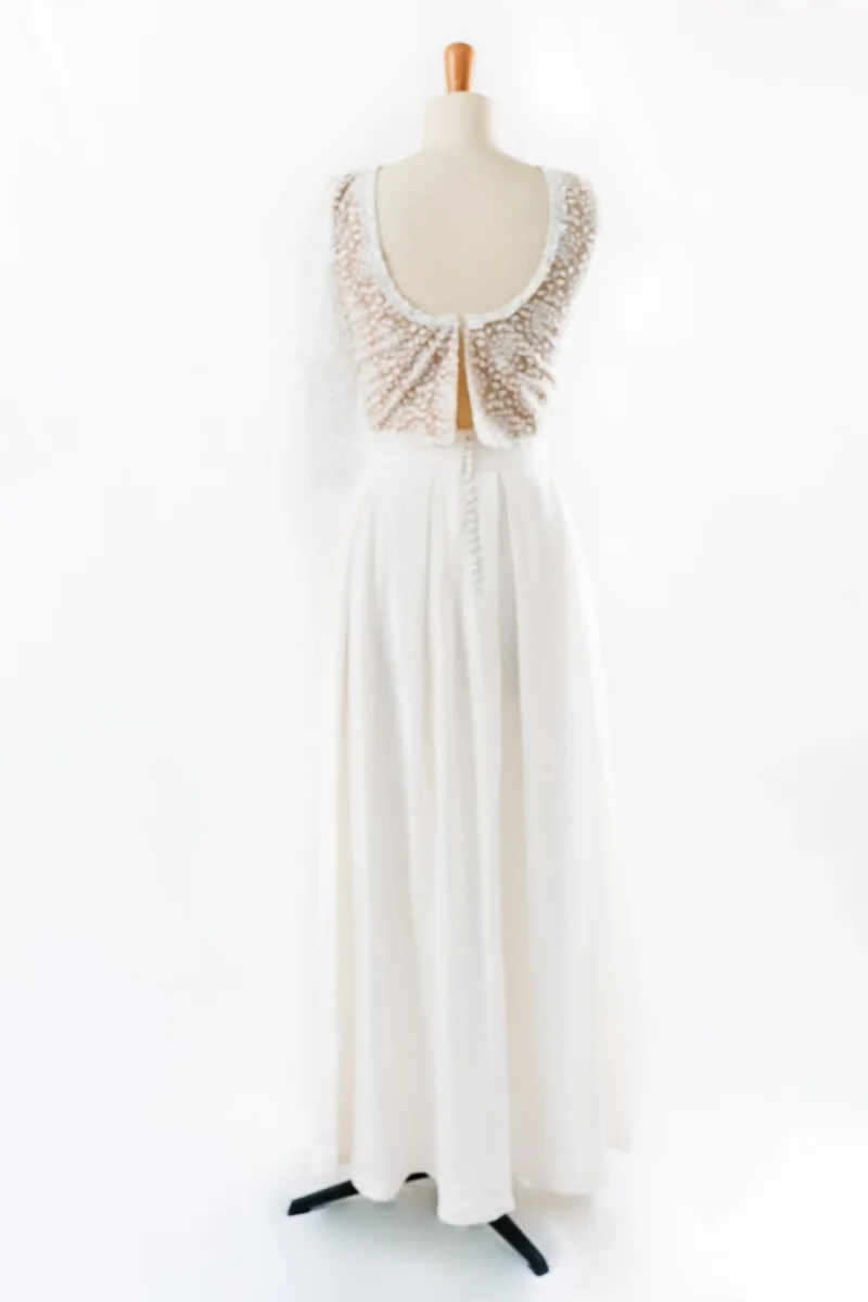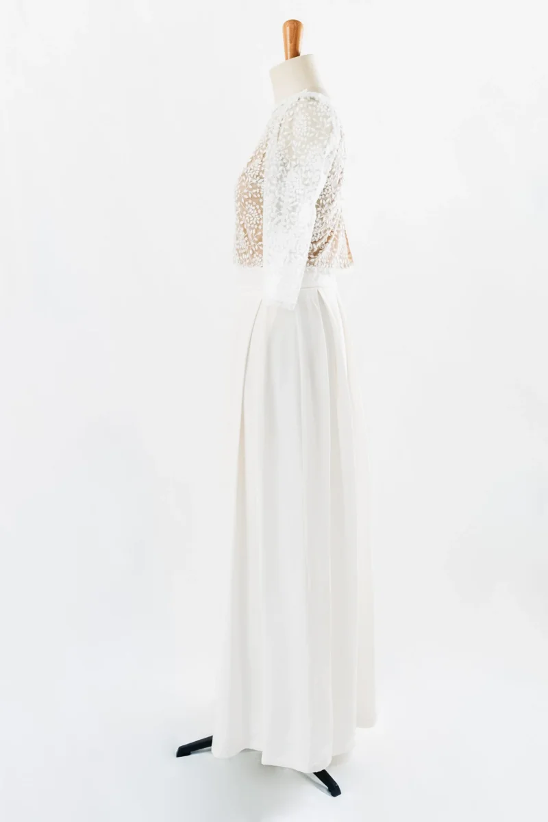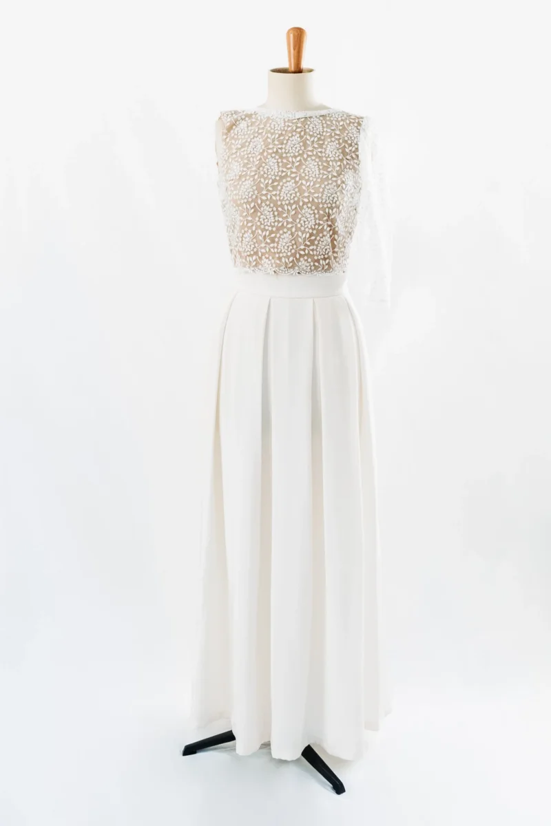 Après son mariage, Elisabeth souhaiterait que sa tenue profite à une autre future mariée, c’est pourquoi elle propose à la vente son top personnalisé l’Evaporée avec de jolies manches longues tout en tulle brodé.