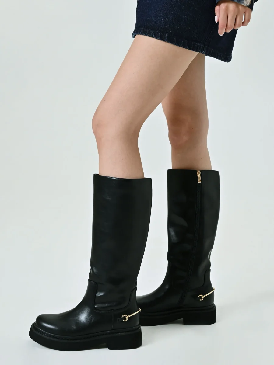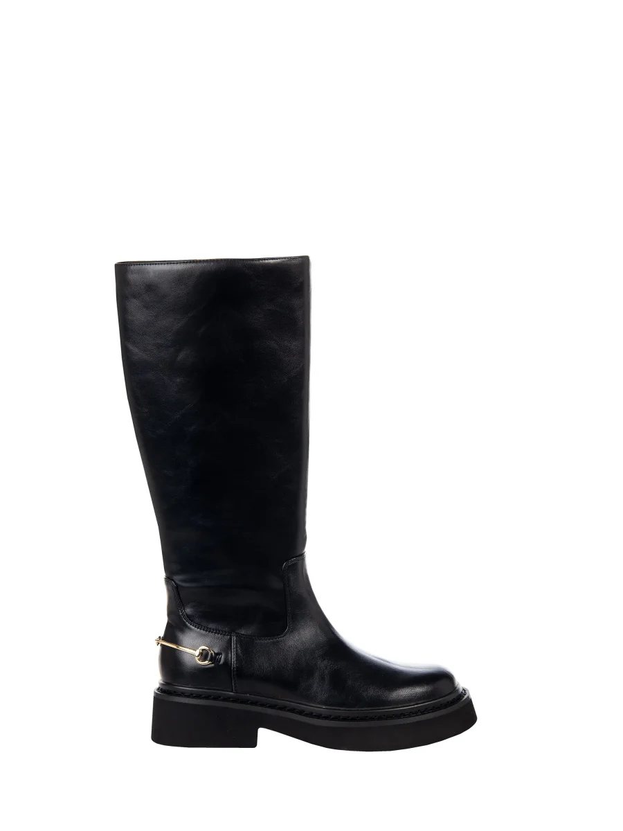Gli Stivali con Morsetto si distinguono per il gambale alto e il design essenziale, arricchito da un morsetto metallico dorato sul retro. La suola platform e la punta arrotondata assicurano comfort e stile in ogni momento della giornata.