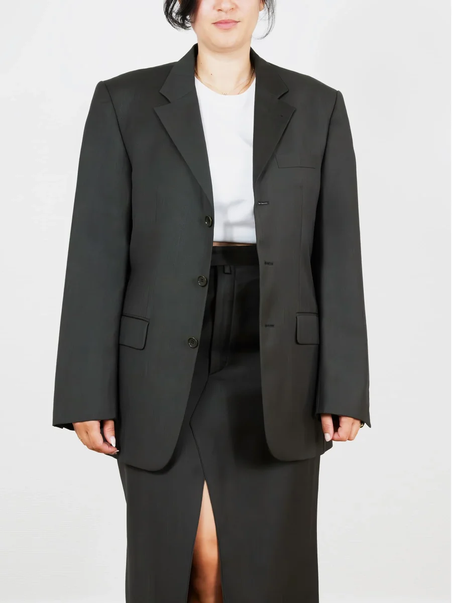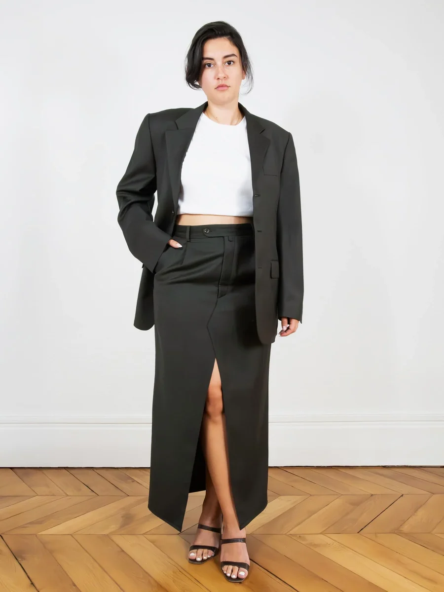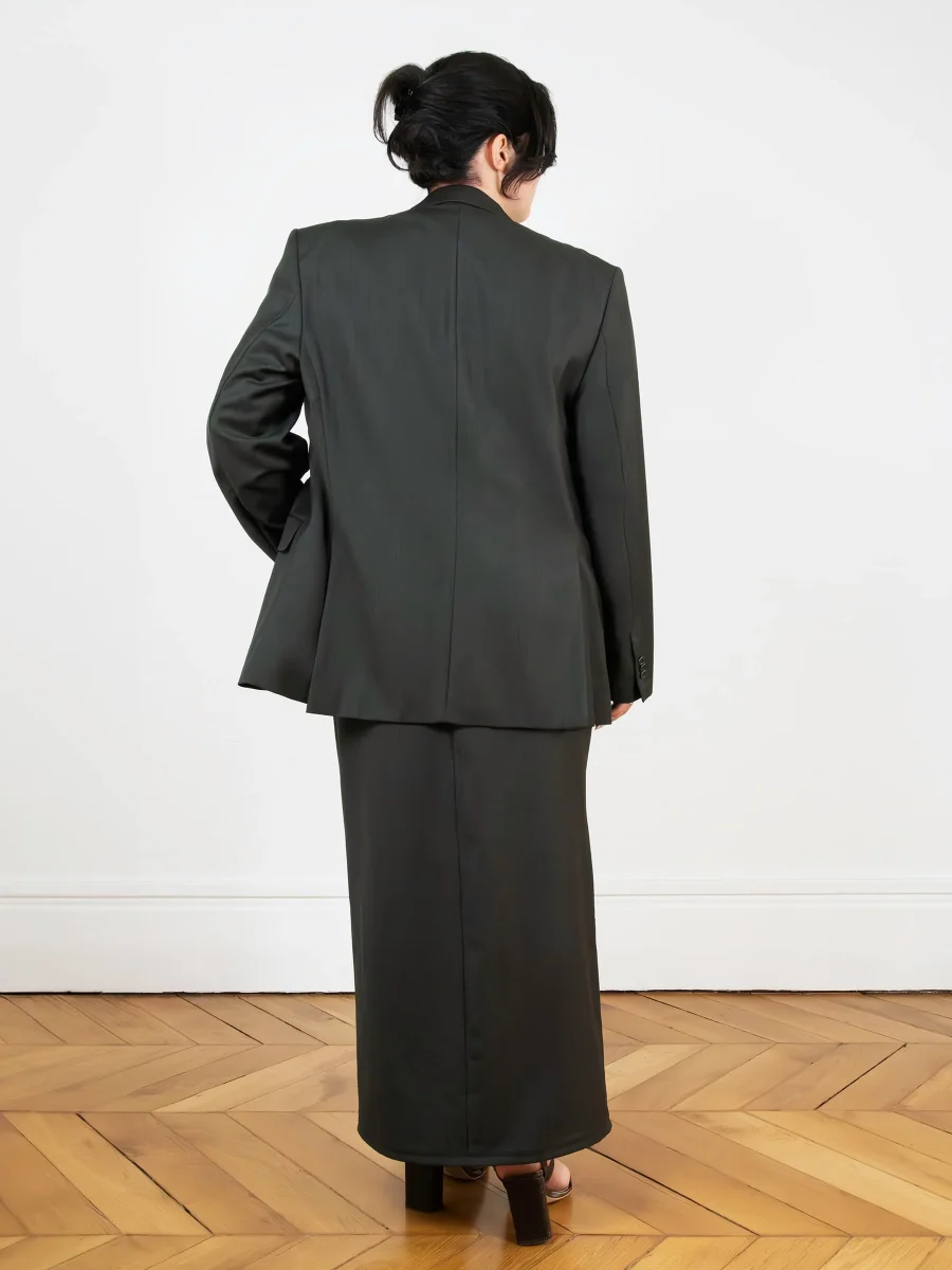 Ensemble tailleur composé d’un blazer oversize et d’une longue jupe droite fendue sur l’avant. Blazer et jupe avec poches.