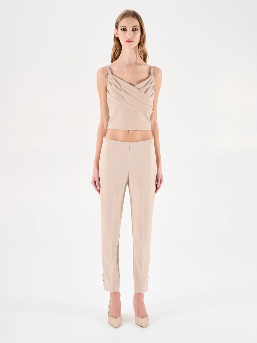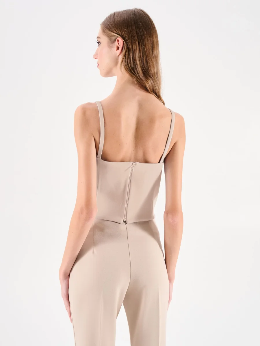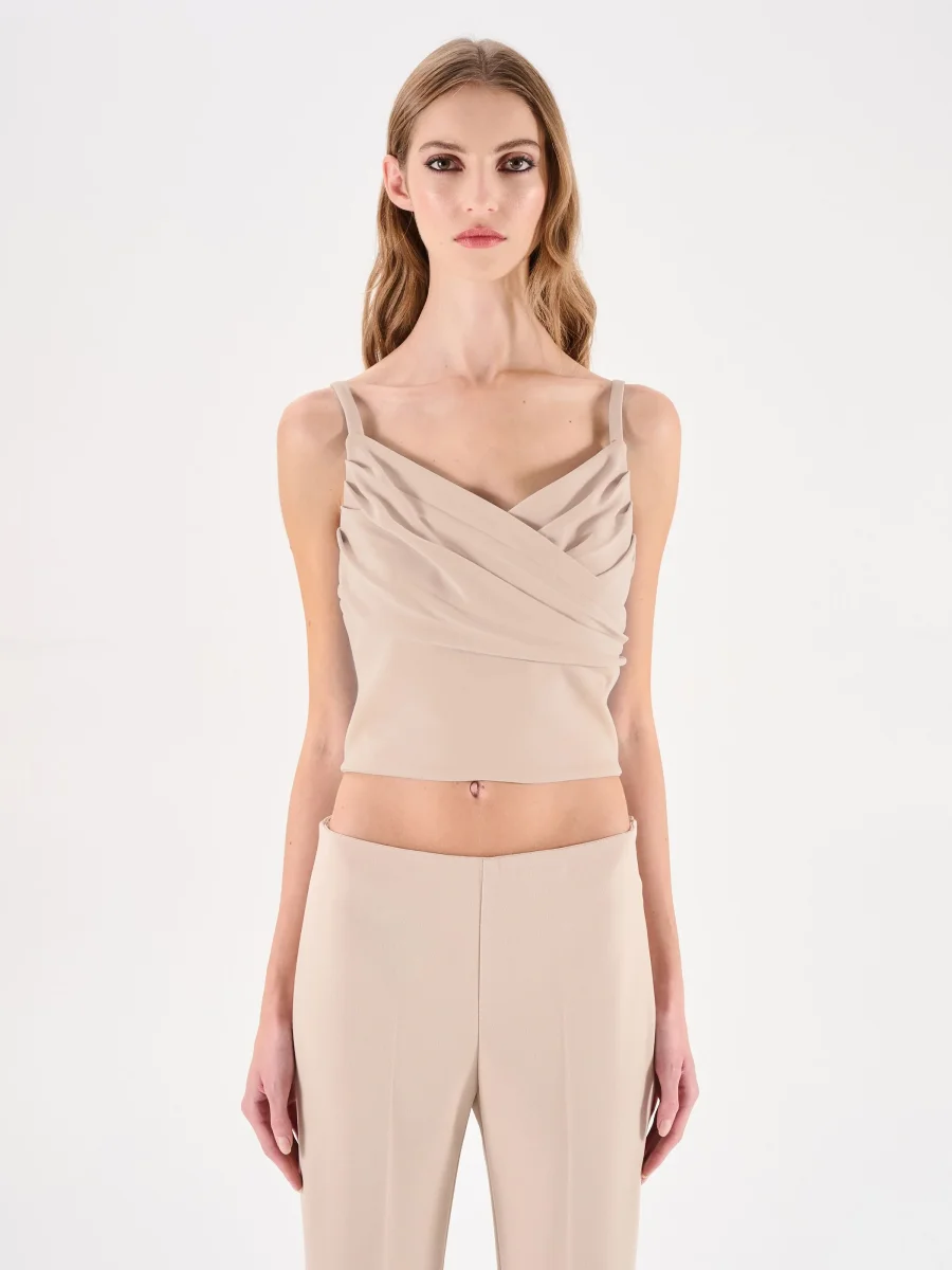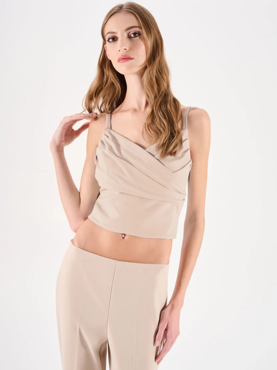 Linee scultoree e un’eleganza discreta disegnano il carattere del top beige chiaro, un capo essenziale che si distingue per la sua lavorazione ricercata. Realizzato in confortevole tessuto tecnico, è definito da un profondo scollo a V e da un sapiente drappeggio incrociato che avvolge la figura, creando un delicato movimento di fasce sovrapposte. Le spalline larghe garantiscono un ottimo sostegno e bilanciano la silhouette, mentre la vestibilità aderente e la lunghezza cropped lo rendono attuale e femminile. La pratica chiusura con zip sul retro assicura una linea pulita e un indosso perfetto. Pensato per essere un passe-partout del guardaroba, questo top si presta a molteplici interpretazioni: indossalo come raffinato sottogiacca per dare un tocco di novità ai completi da ufficio, oppure sceglilo come protagonista di un look abbinandolo a pantaloni palazzo o a una gonna a vita alta. La sua tonalità neutra si sposa facilmente con i colori di stagione, rendendolo un vero investimento di stile.