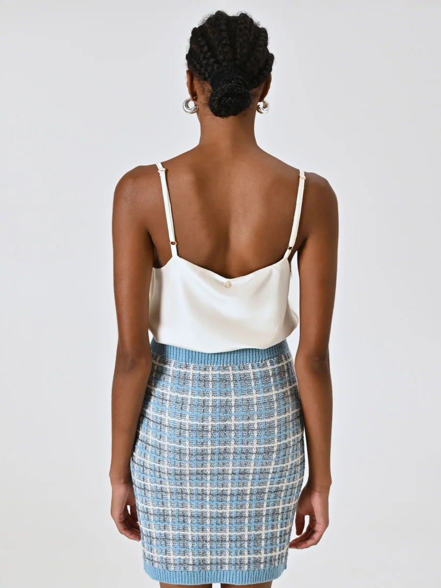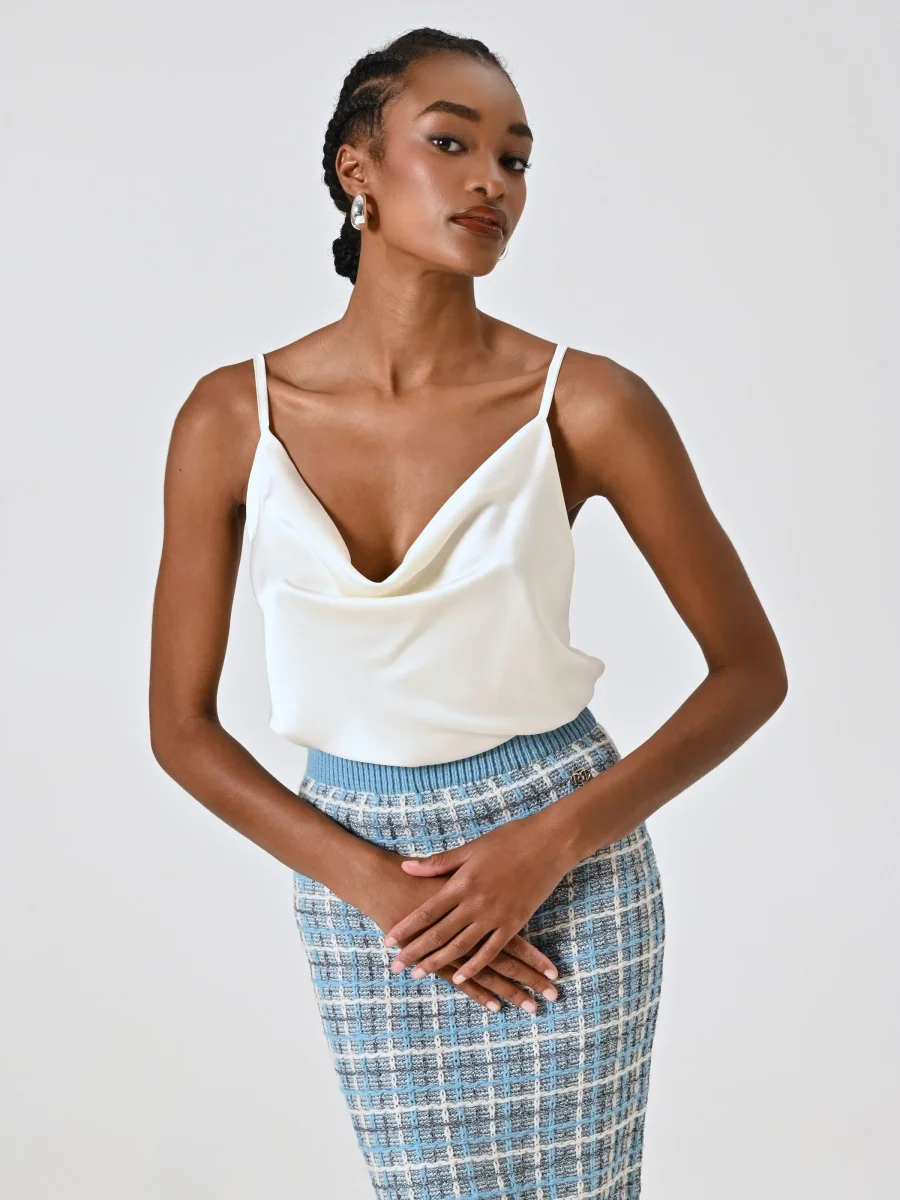 Realizzato in raso, il Top con Scollo Drappeggiato è caratterizzato da spalline sottili regolabili e da uno scollo drappeggiato che valorizza la silhouette con delicatezza e fluidità.