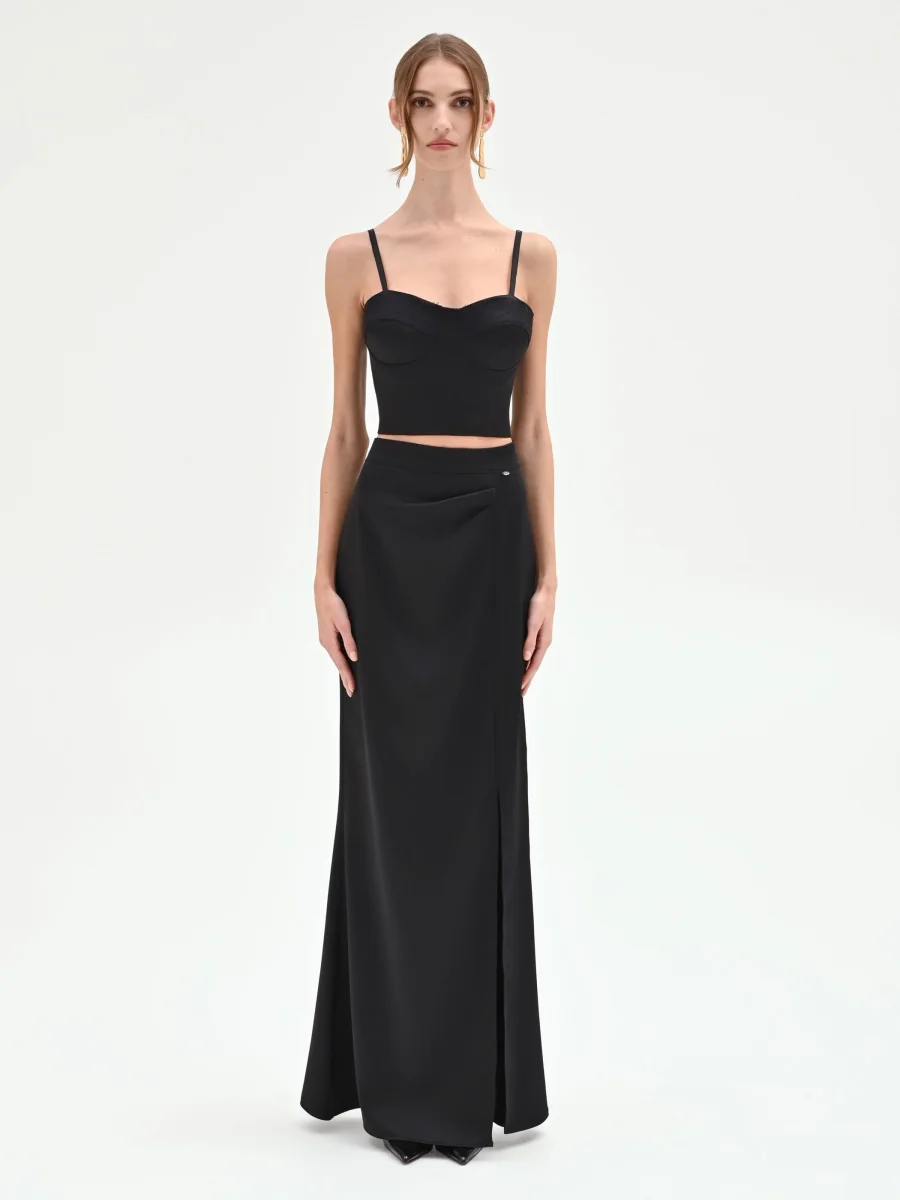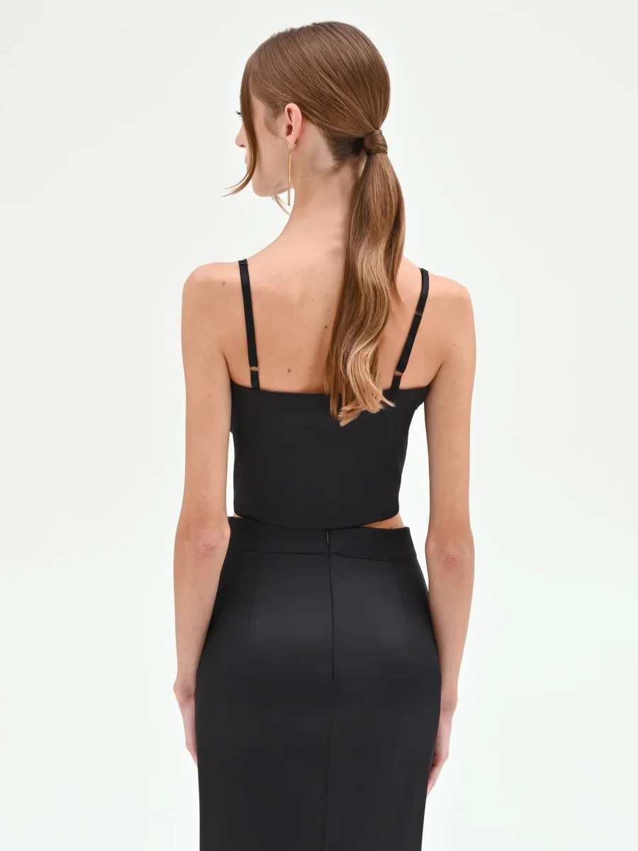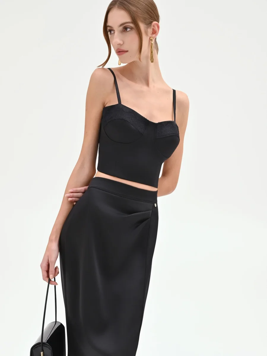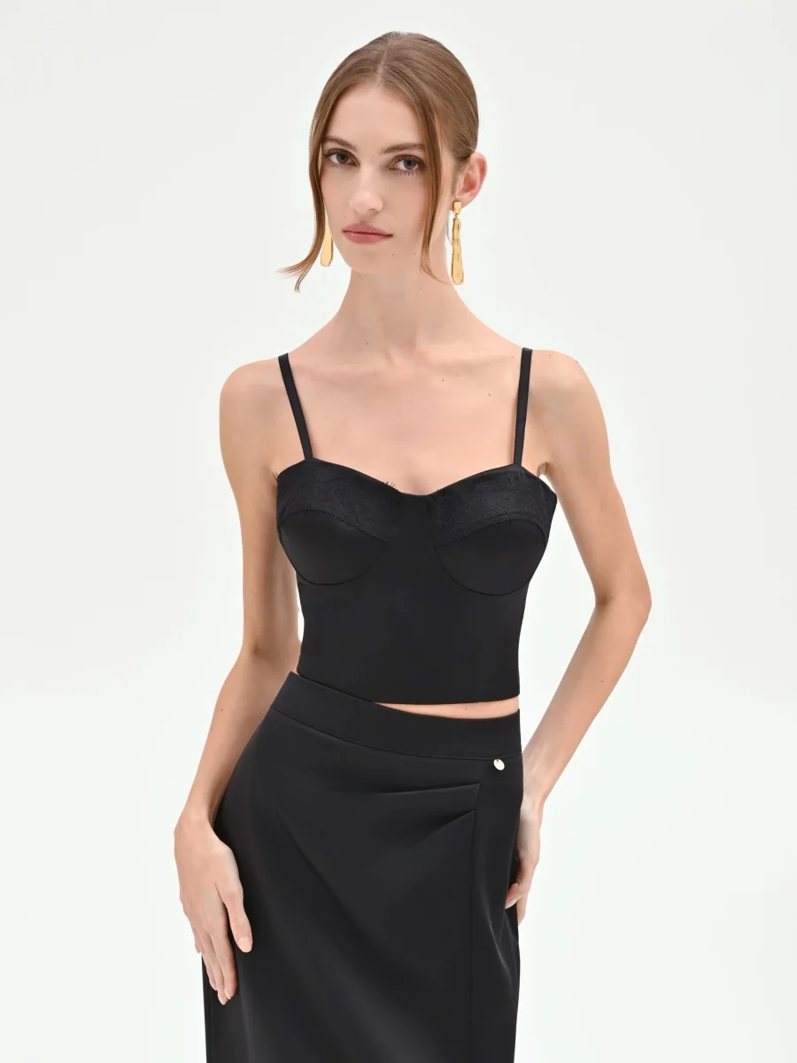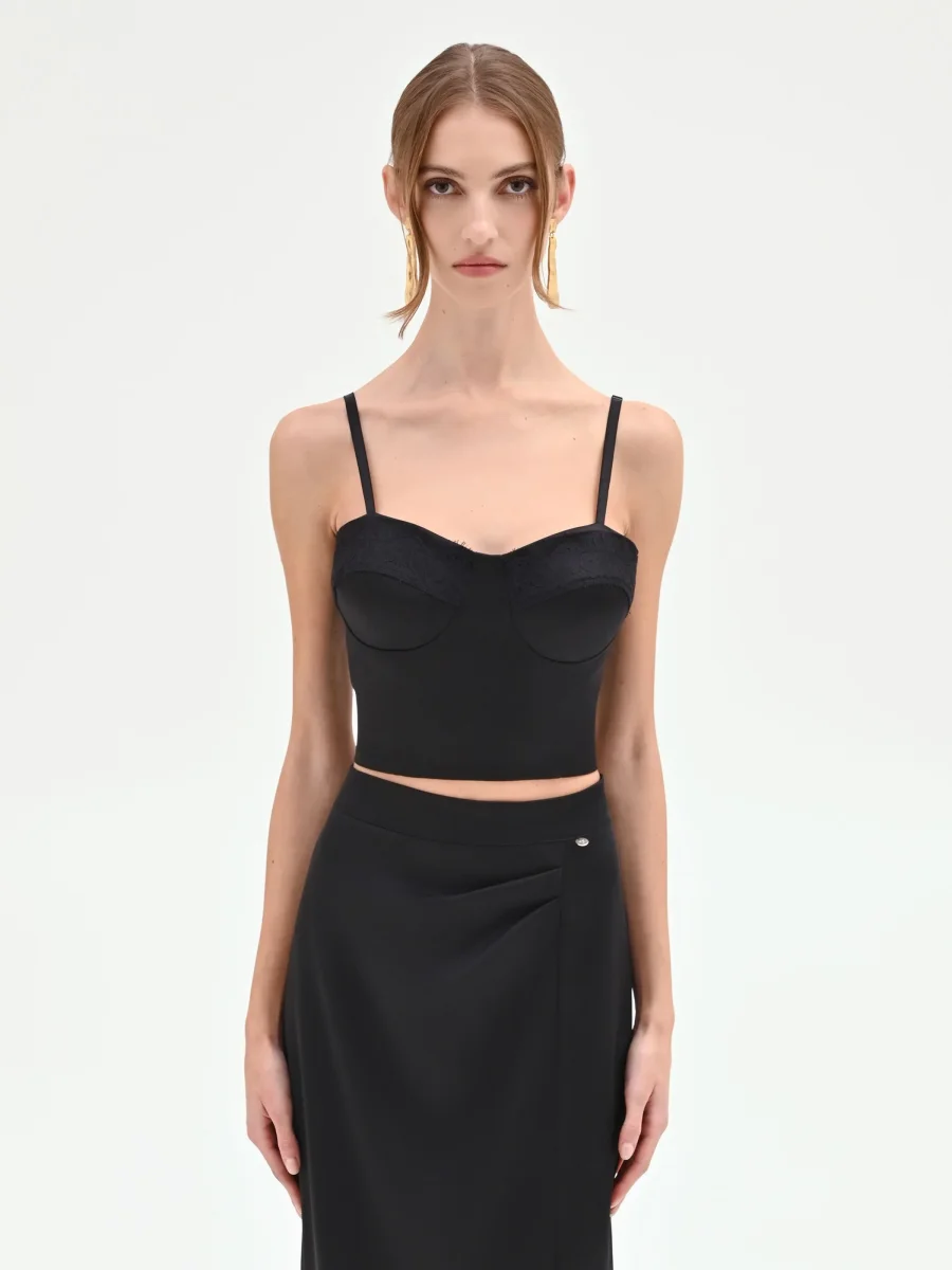 Il top bustier nero rivela un’anima notturna e seducente, unendo la struttura del corpetto all’intramontabile fascino del pizzo. Il suo design è un equilibrio di forme e dettagli: lo scollo a cuore, romantico e femminile, è delineato da un inserto in pizzo tono su tono che impreziosisce il décolleté. La costruzione, studiata per valorizzare la figura, presenta coppe preformate e cuciture verticali che disegnano una silhouette aderente e sinuosa, mentre il modello corto e le spalline sottili lasciano le spalle scoperte, aggiungendo un tocco di audacia.