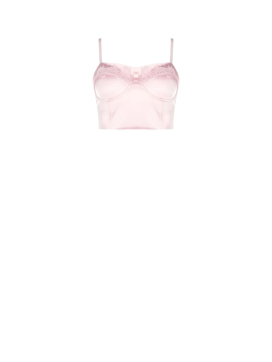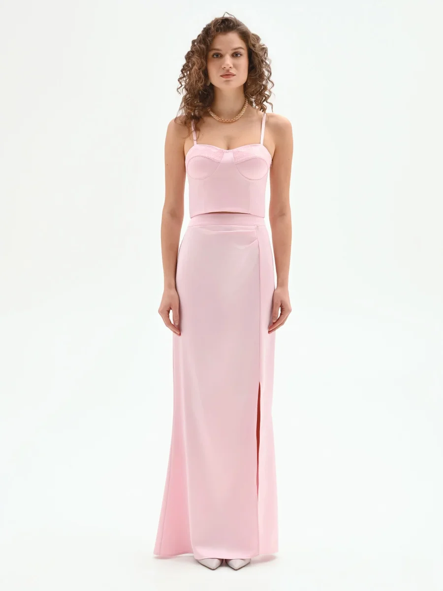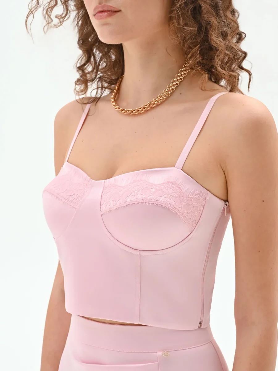 La femminilità si esprime attraverso linee pulite e dettagli ricercati nel top bustier rosa pastello, un capo pensato per illuminare i momenti speciali con un’eleganza contemporanea. La sua struttura, ispirata alla corsetteria, è realizzata in raso liscio che scivola sulla figura, valorizzandola. Lo scollo a cuore, romantico e attuale, è delineato da coppe preformate e da un’applicazione in pizzo tono su tono che ne decora il profilo, aggiungendo una nota di stile. Le cuciture verticali definiscono la silhouette aderente, creando un design armonioso. La vestibilità è resa confortevole e personalizzabile grazie alle spalline sottili regolabili e alla pratica chiusura con zip posteriore. Ideale per comporre outfit da cerimonia, trova la sua massima espressione in abbinamento alla gonna coordinata (codice CFC0127576003) e al coprispalle (codice CFC0127726003), per un total look impeccabile.