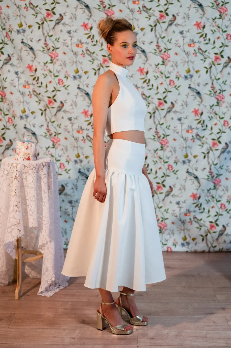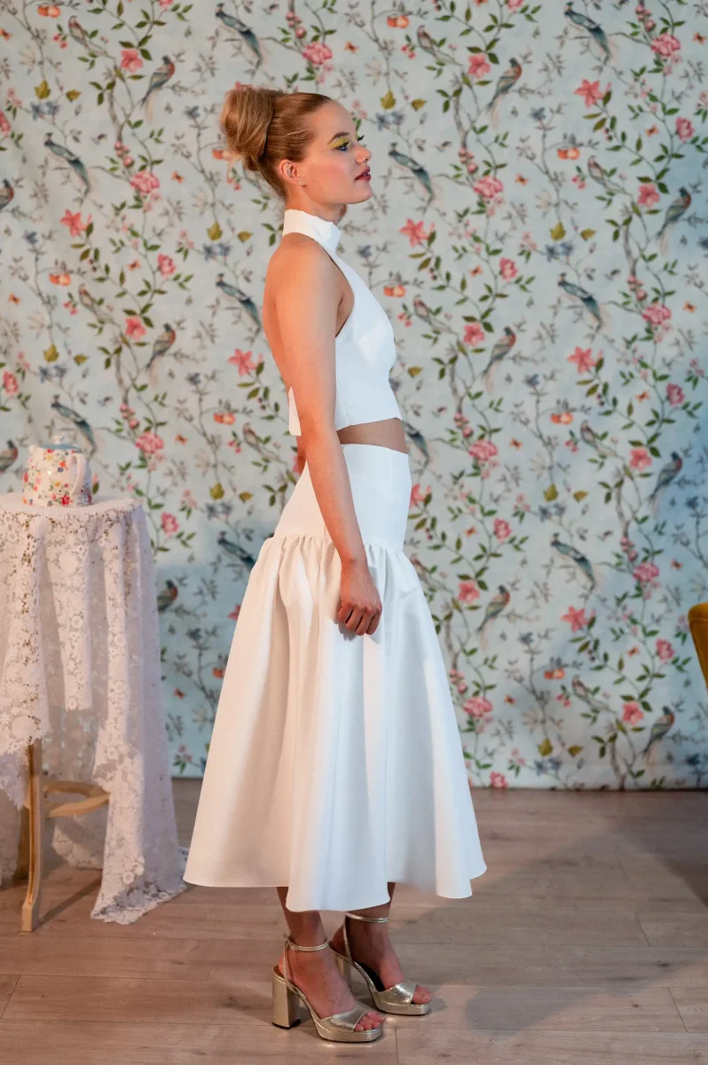 Les détails qui font tout : Top court au col montant et dos nu Silhouette à la fois structurée et féminine