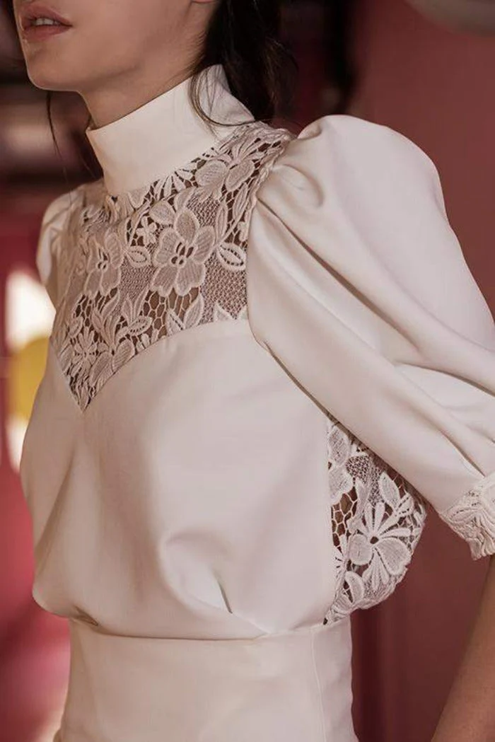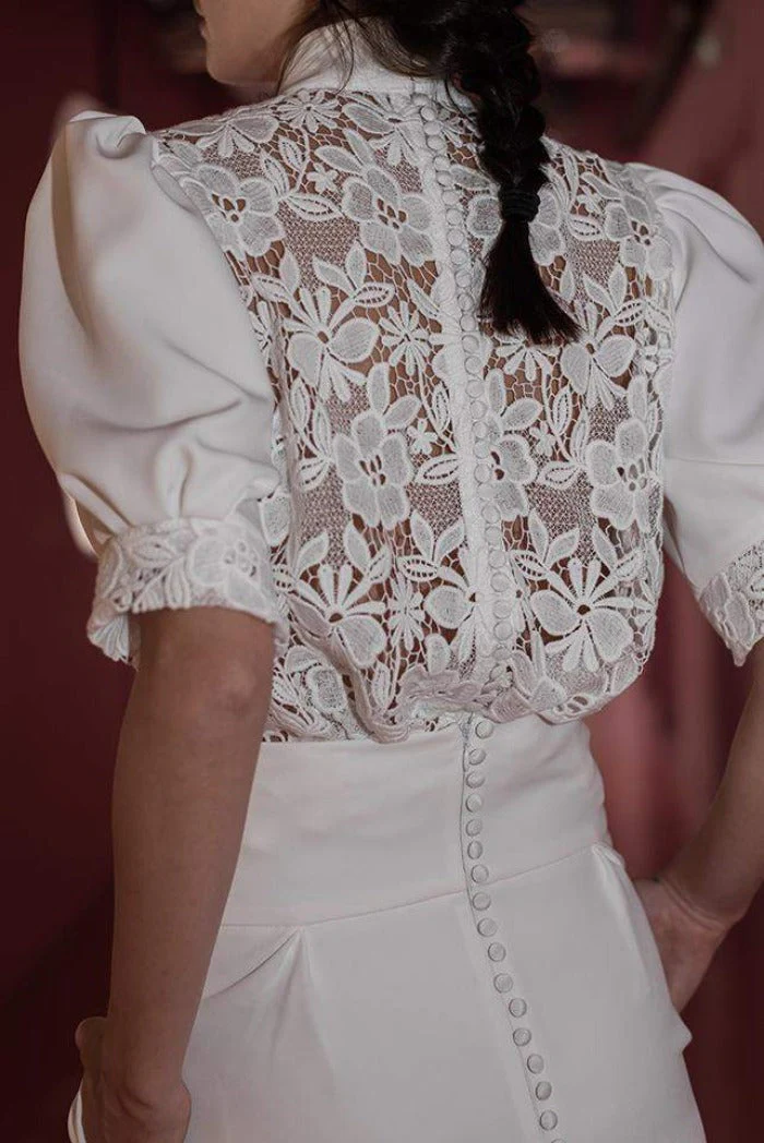 Top col montant, incrustation de guipure devant et dos ajouré entièrement boutonné.