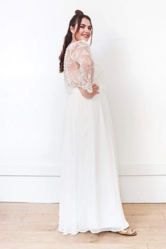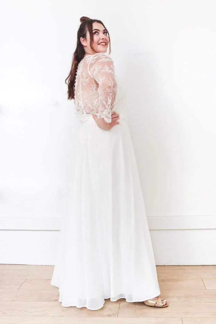 Top dentelle, col V, dos transparent et boutonné, manches 3/4.