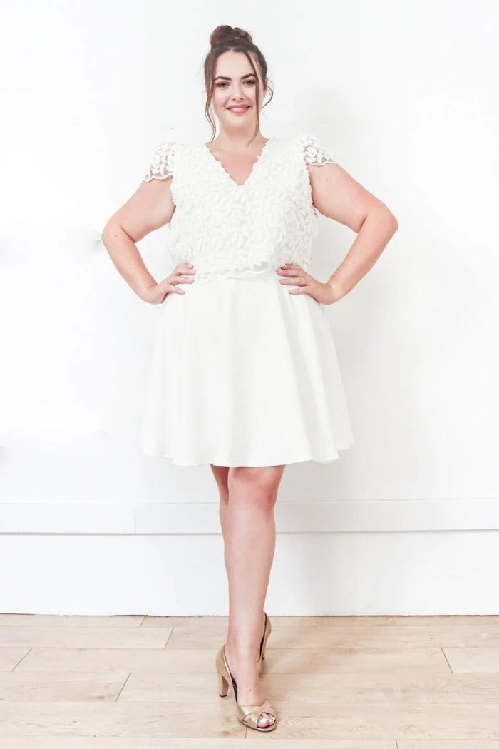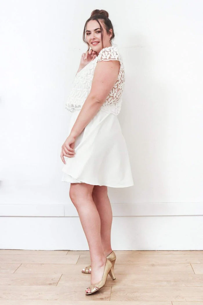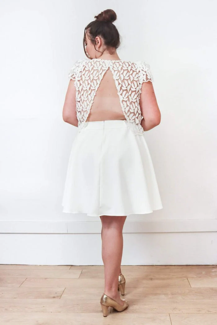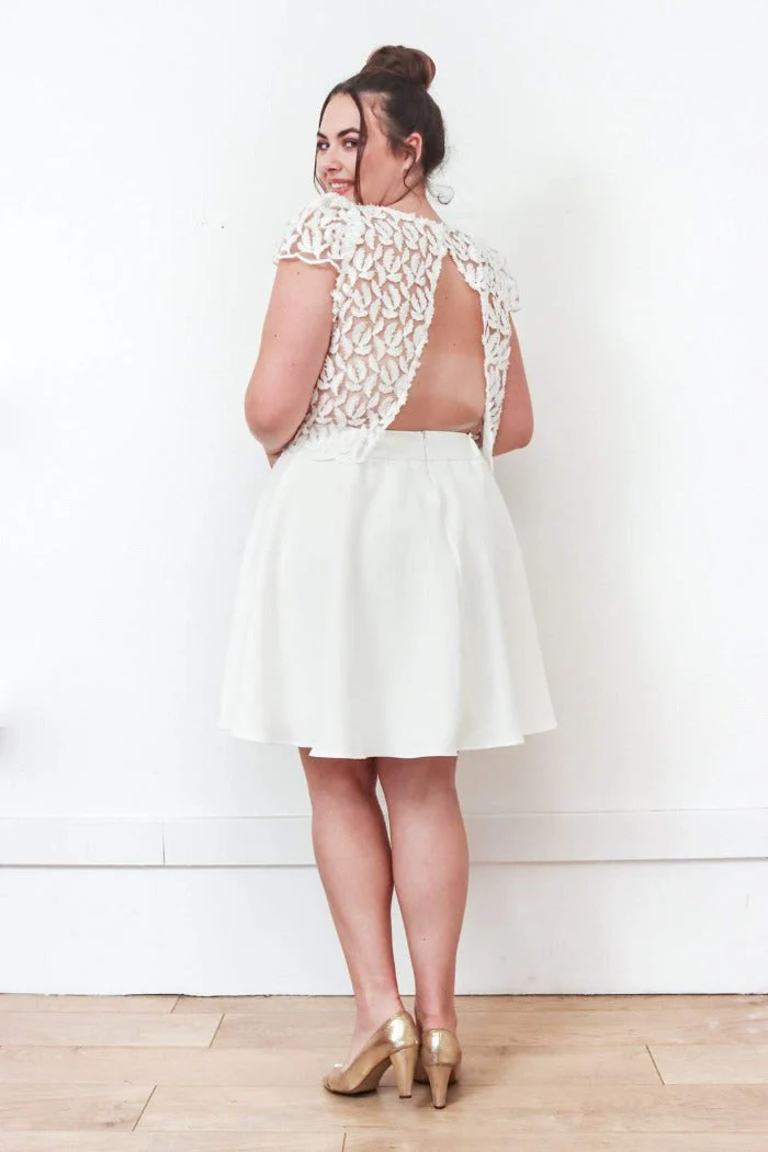 Crop top de mariée, grande taille, en dentelle plume et dos nu inversé.