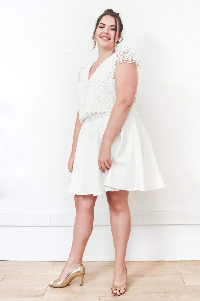 🇫🇷 Fabriqué en France 🇫🇷 – à partir de :Ensemble 625€ / Jupe 300€ / Top 330€ ⬇ message alerte ⬇ Ensemble ICI Jupe seule ICI Description Crop top de mariée, grande taille, en dentelle plume et dos nu inversé. Tissu : – Crêpe de soie 100%, doublure soie et Dentelle – Crêpe de polyester […]