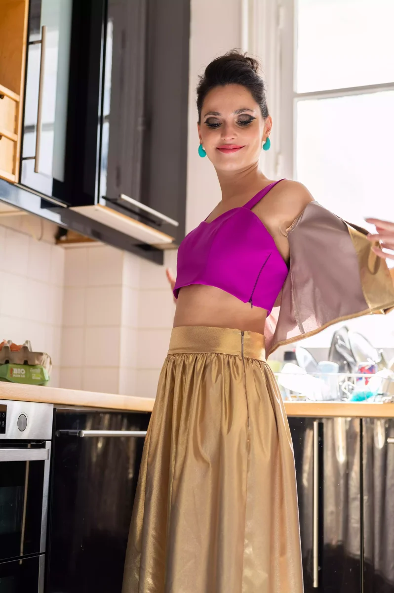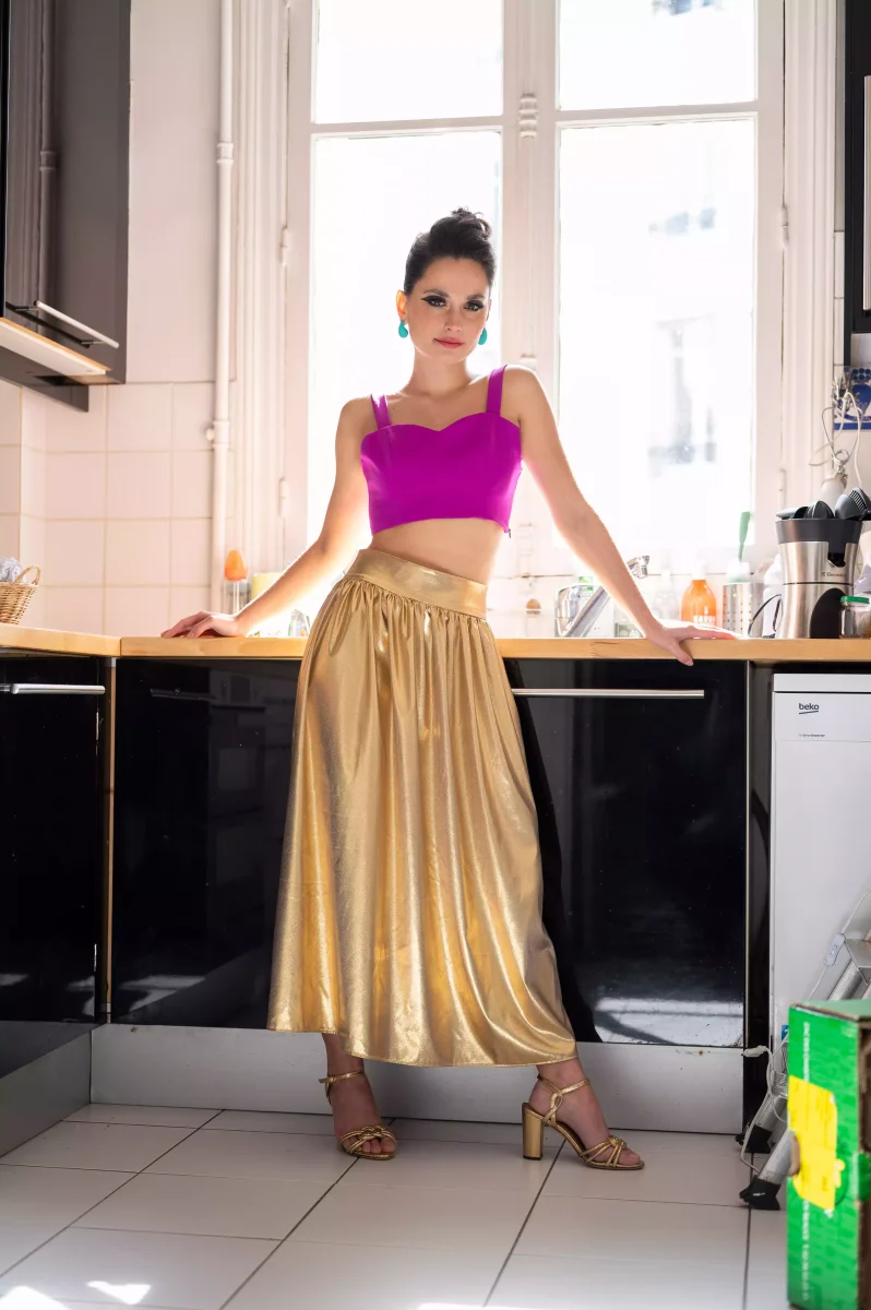Crop top de couleur violette vive, avec un design simple et épuré. Le top a une coupe courte qui dévoile une partie du ventre, ce qui souligne son aspect moderne. Le top a des bretelles droites et son dos est légèrement décolleté. Une pièce audacieuse qui pourrait facilement être associé à des pièces plus neutres pour créer un look qui attire l’attention.