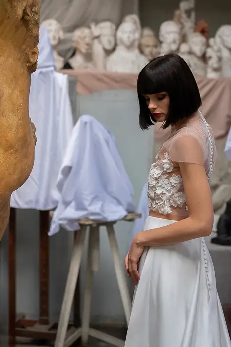 Ensemble a la fois moderne et romantique composé d’un top col montant en tulle brodé à la main de fleurs en dentelle pour dissimuler votre poitrine qui laissera un dos tout en transparence habillé uniquement d’une délicate rangé de boutons. Sa jupe longue en satin duchesse, évasée avec sa grande traine saura parfaitement compléter cette silhouette.