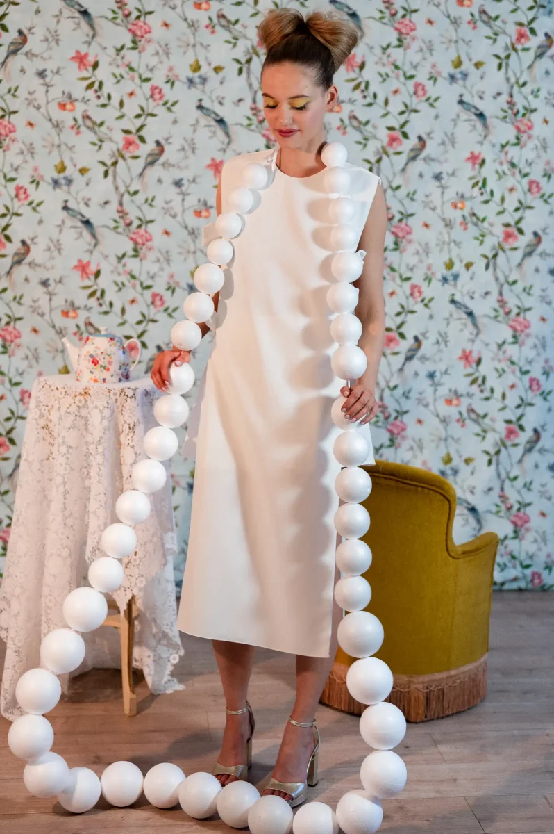 Emma mesure 1,70 m, porte une taille 36 et complète la silhouette avec les plateformes Or Blanc de chez Rivecour.