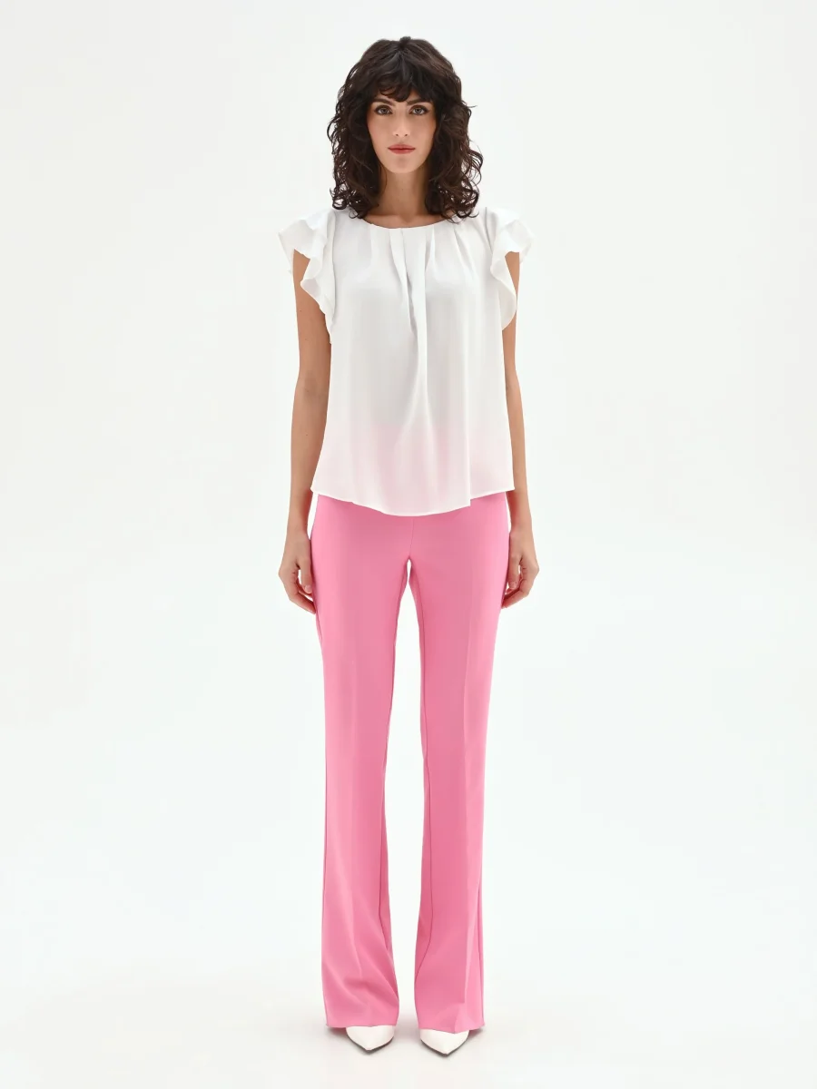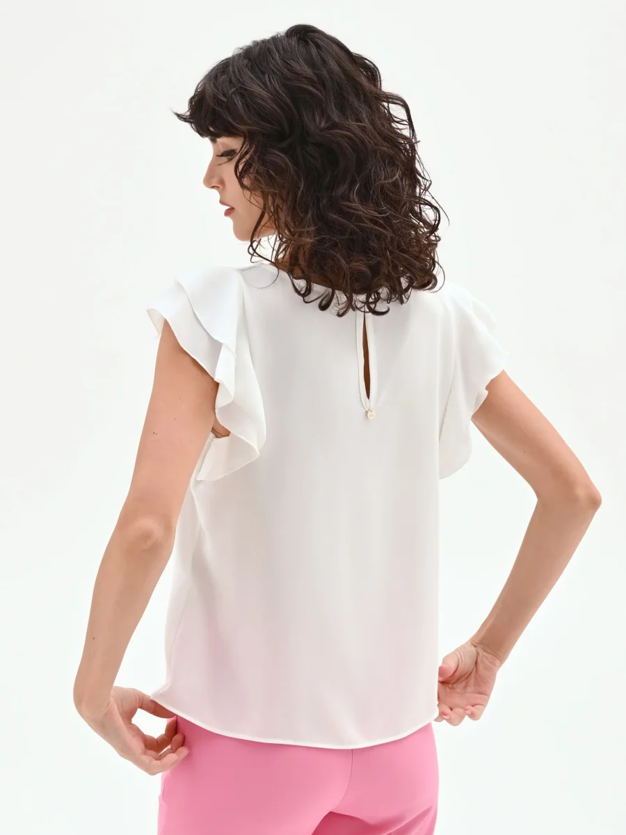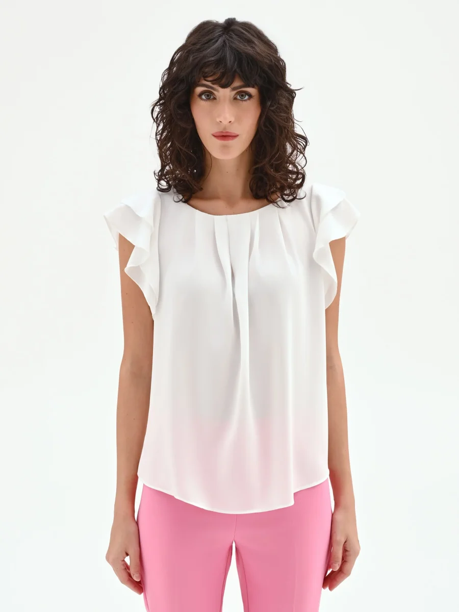 Un tocco di luce e fluidità per il guardaroba di ogni giorno e per le occasioni che richiedono un’eleganza discreta. Questo top color panna è un capo essenziale che si distingue per la sua raffinata semplicità, capace di adattarsi a molteplici interpretazioni di stile. Realizzato in raso leggero, presenta un girocollo impreziosito da una lieve arricciatura che genera un delicato movimento drappeggiato sul davanti. Le maniche corte a farfalla, definite da un morbido volant, accarezzano le spalle conferendo un’allure femminile e romantica al design. La linea è dritta e scivolata, pensata per offrire una vestibilità confortevole e versatile. La chiusura con piccolo bottoncino posteriore mantiene pulita la silhouette del capo. Indossalo come sottogiacca per completare un tailleur da ufficio o abbinalo a una gonna a vita alta per un look più ricercato. È il passe-partout perfetto per completare ogni outfit con un tocco di classe senza tempo.