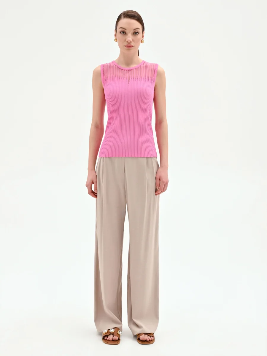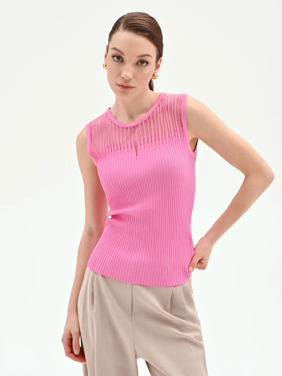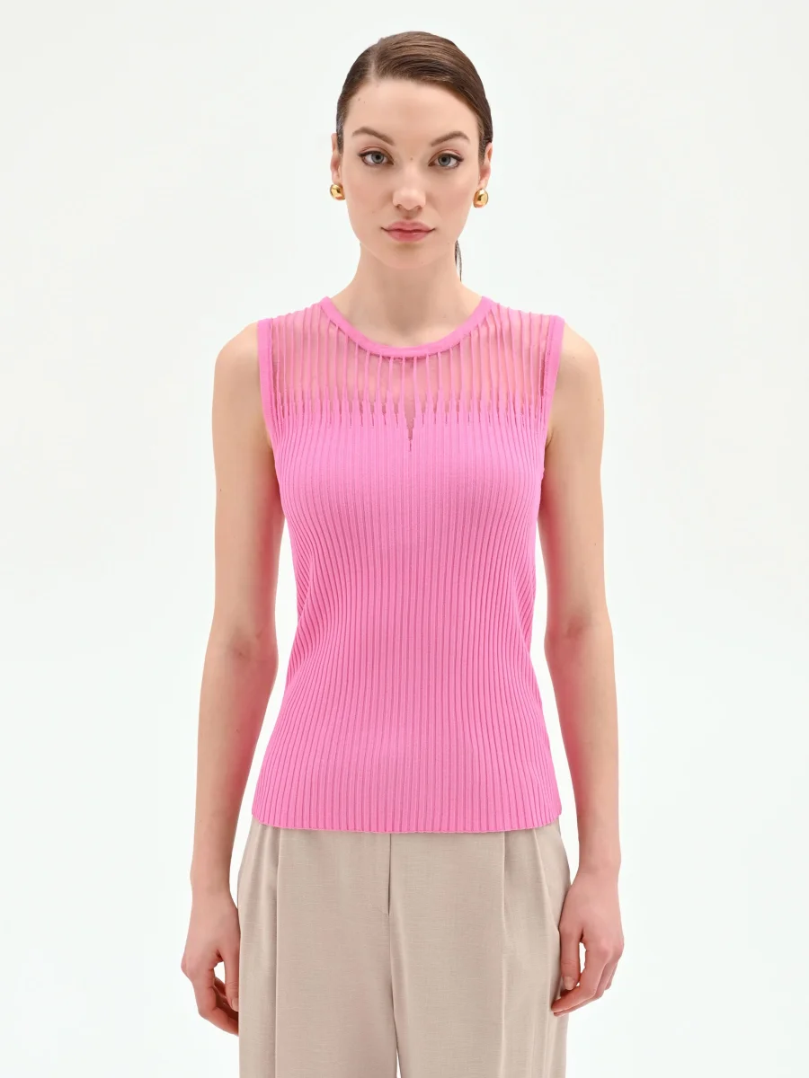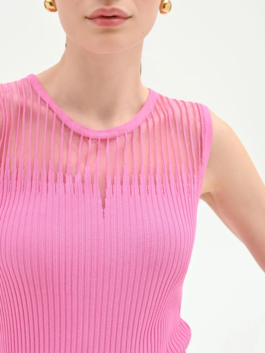 Realizzato in morbida viscosa lavorata a costine, presenta una vestibilità aderente che valorizza con naturalezza la silhouette senza costringere. Il design si arricchisce di un inserto semitrasparente sul carré anteriore, definito da una lavorazione a righe verticali che crea un delicato gioco di texture. Sotto l’inserto, una piccola apertura a goccia aggiunge un tocco di grazia al modello, interrompendo con eleganza la linearità del girocollo. Questo top smanicato si indossa con facilità grazie al suo design essenziale.