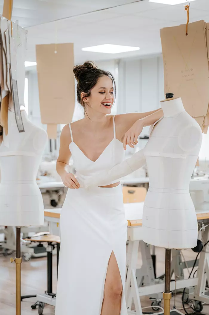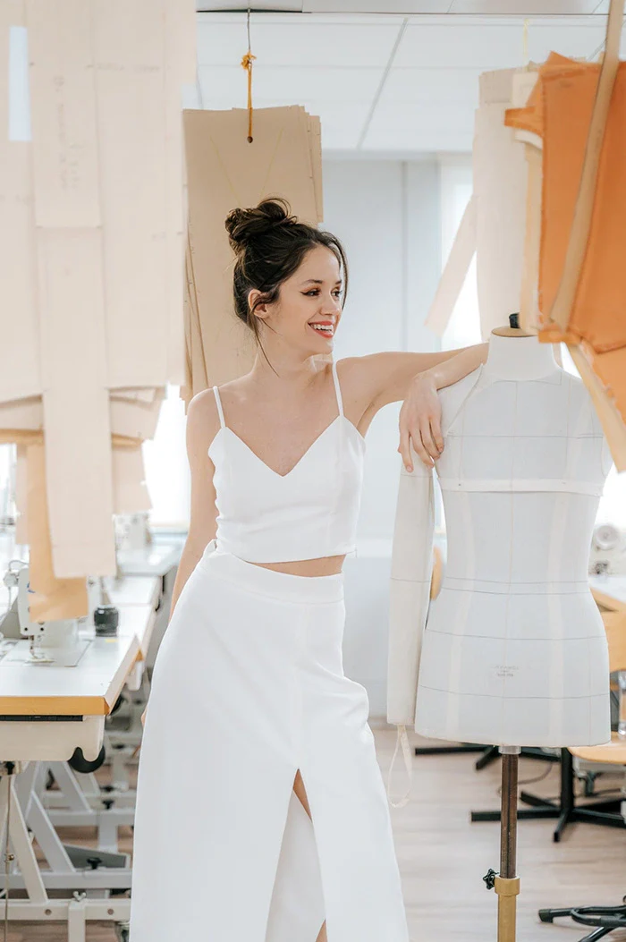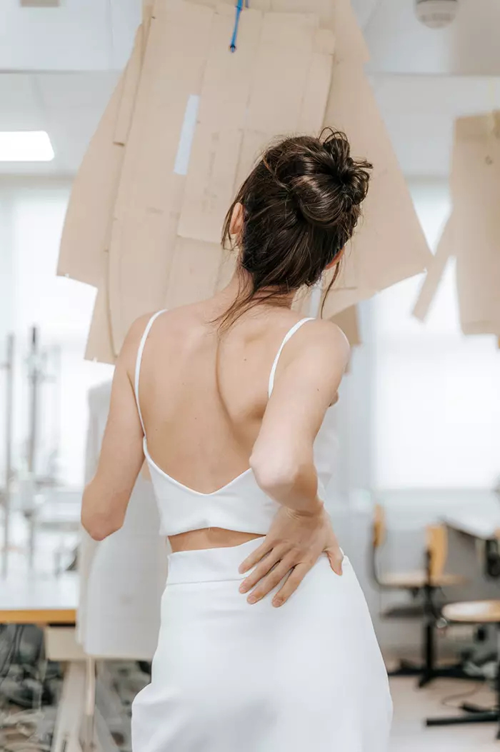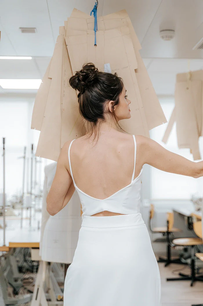 Ce top à bretelles dos nu est une pièce délicate et élégante, parfaite pour les mariées qui cherchent à allier modernité et charme le jour de leur mariage civil. Sa coupe ajustée, son encolure en V et son dos nu apportent une touche de sensualité discrète et cette jupe longue, à la fois moderne et sensuelle, présente une fente audacieuse qui dévoile subtilement la jambe. La taille haute et la coupe épurée de cette jupe longue blanche mettent en valeur votre silhouette, tandis que son design contemporain en fait une pièce maîtresse de votre garde-robe nuptiale.