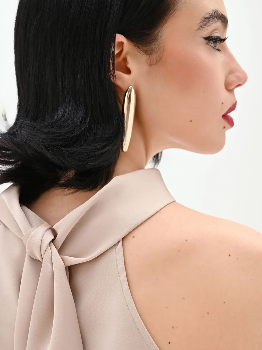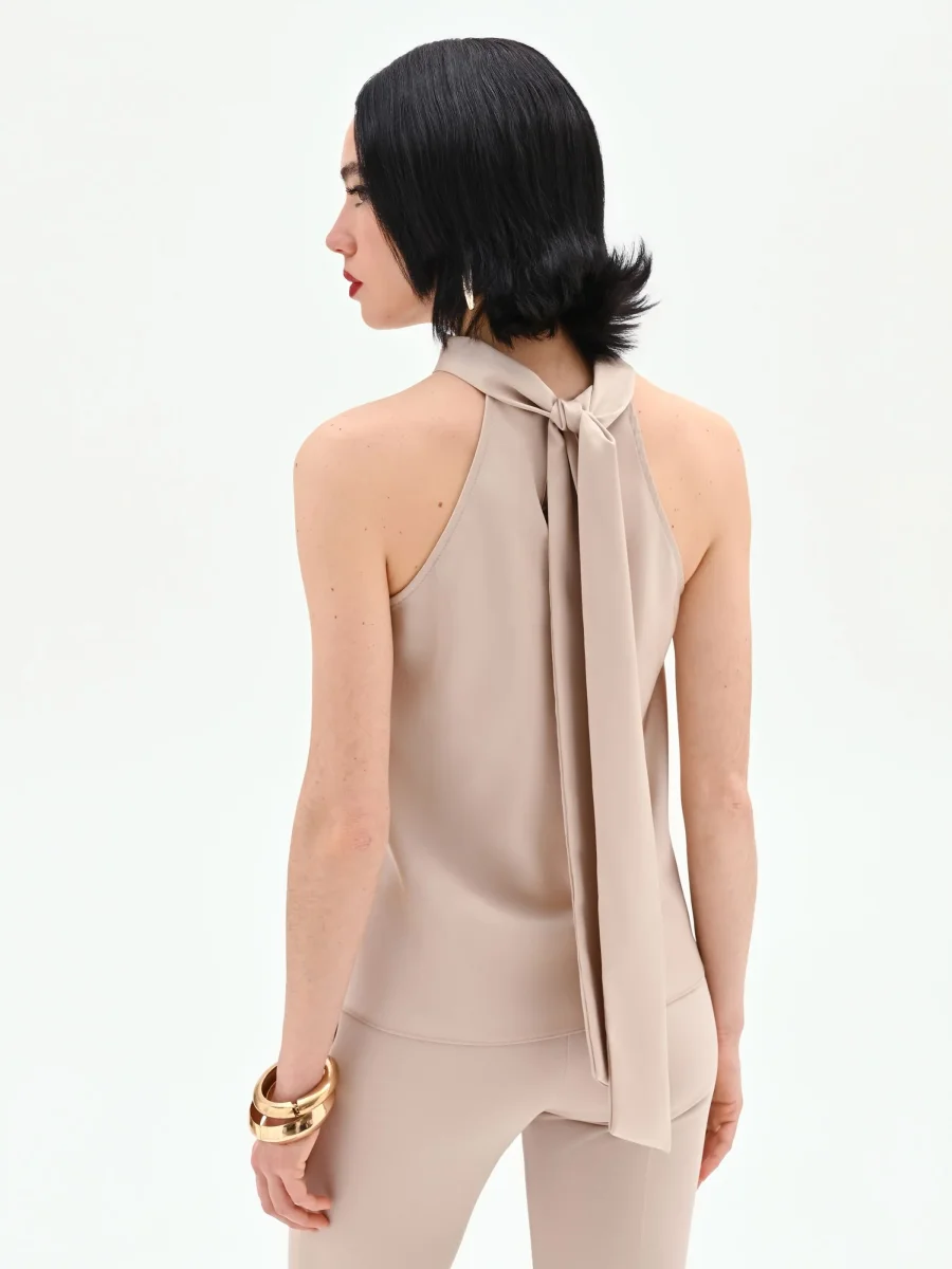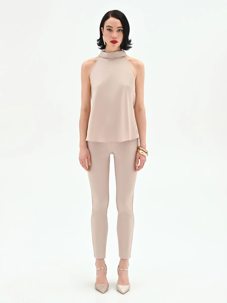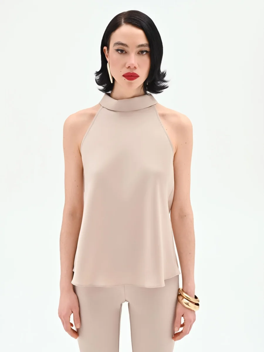 Un’eleganza sussurrata, che si esprime attraverso linee pulite e una tonalità neutra e sofisticata. Il top smanicato tortora beige è un capo essenziale che unisce comfort e stile, pensato per essere un alleato versatile del guardaroba. Realizzato in un tessuto fluido e leggero, scivola delicatamente sulla silhouette, offrendo una vestibilità morbida e confortevole. Il design è caratterizzato da un collo alto a fascia, di ispirazione halter, che lascia elegantemente scoperte le spalle, aggiungendo una nota di femminilità discreta al look. Il taglio dritto e la finitura liscia ne fanno una base impeccabile per molteplici abbinamenti, dal più formale al casual. Indossalo come sottogiacca per completare un tailleur da ufficio o lascialo protagonista con un pantalone a vita alta per un’uscita serale. È un pezzo chiave, pensato per accompagnare la donna Rinascimento con stile e praticità in diverse occasioni.