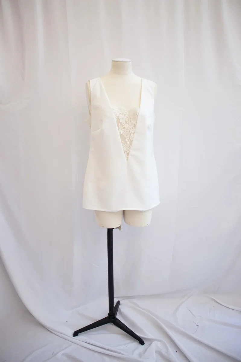 Fabriqué en France ⬇ message alerte ⬇ Attention ! La vente privée se déroule exclusivement en ligne. Aucun essayage n’est possible au showroom. Description Matières : – Polyester et dentelle Couleurs : – Blanc Conseils D’entretien Livraison et Retours
