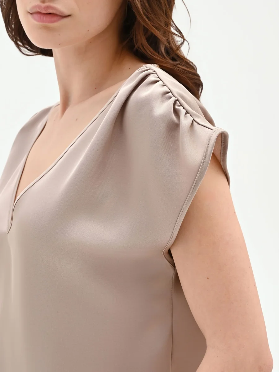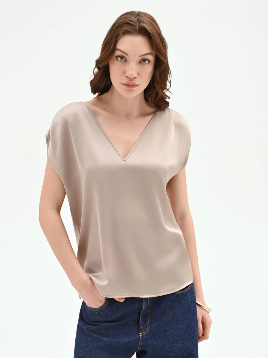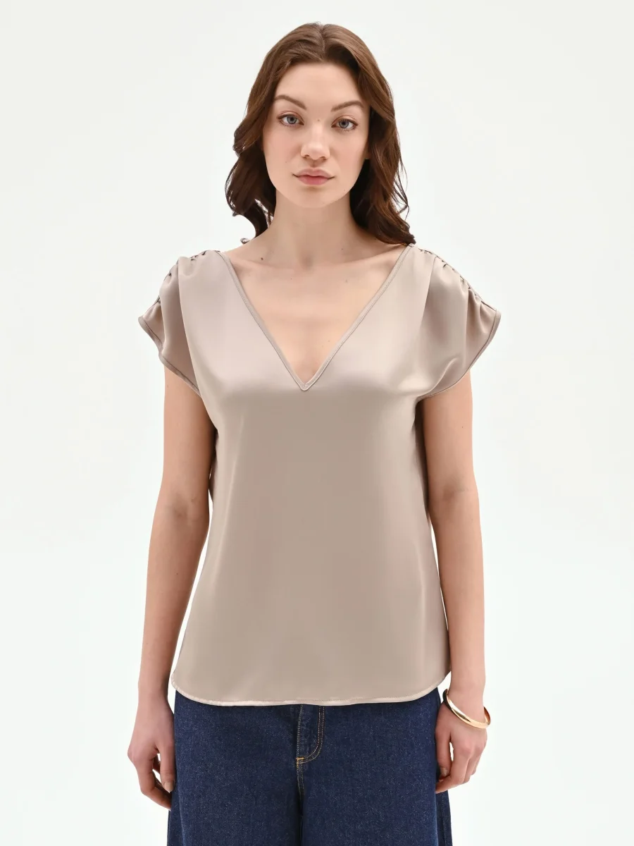 Un gioco di luce e fluidità definisce il top color tortora beige, un capo essenziale pensato per interpretare con eleganza la quotidianità.