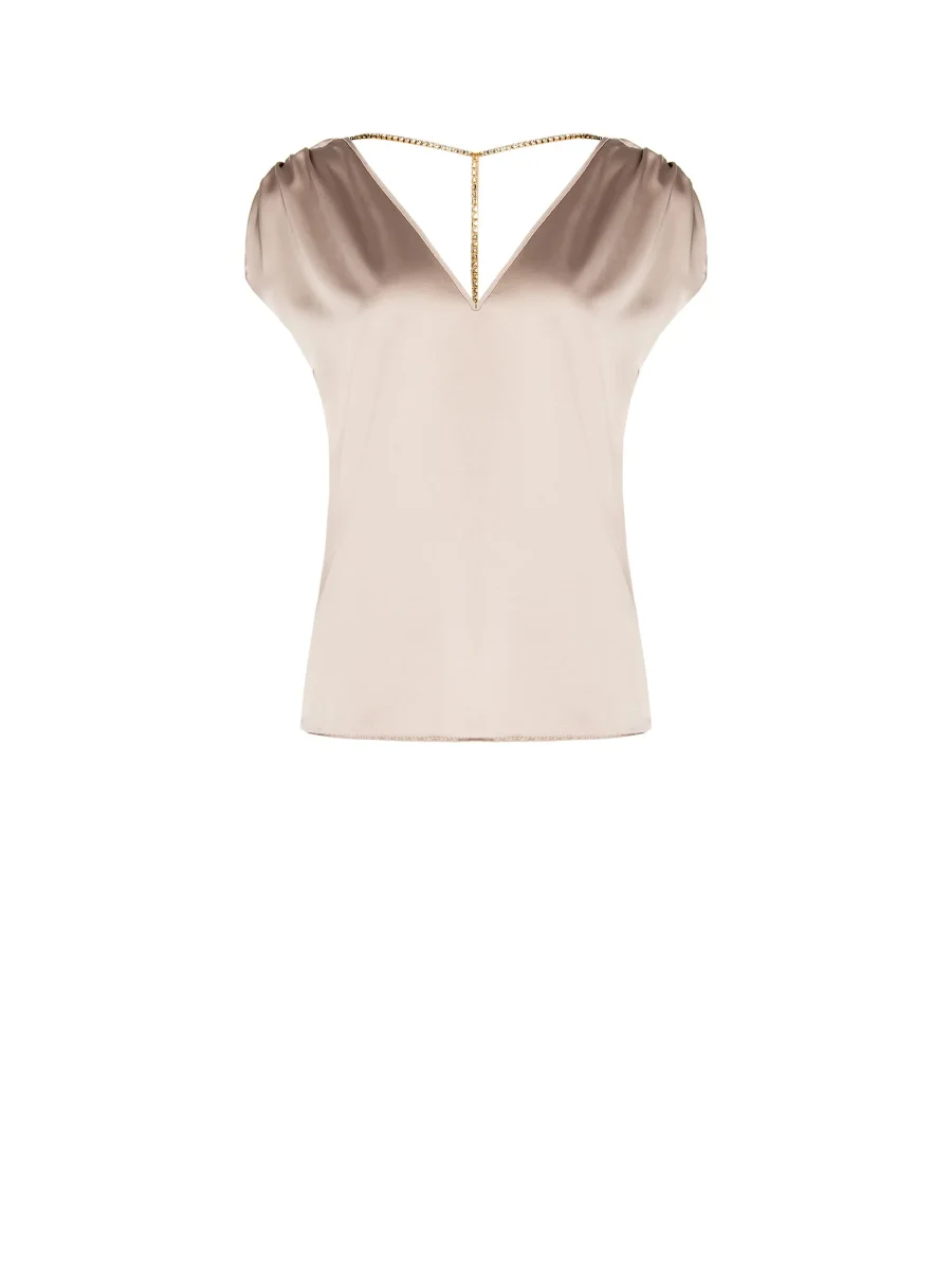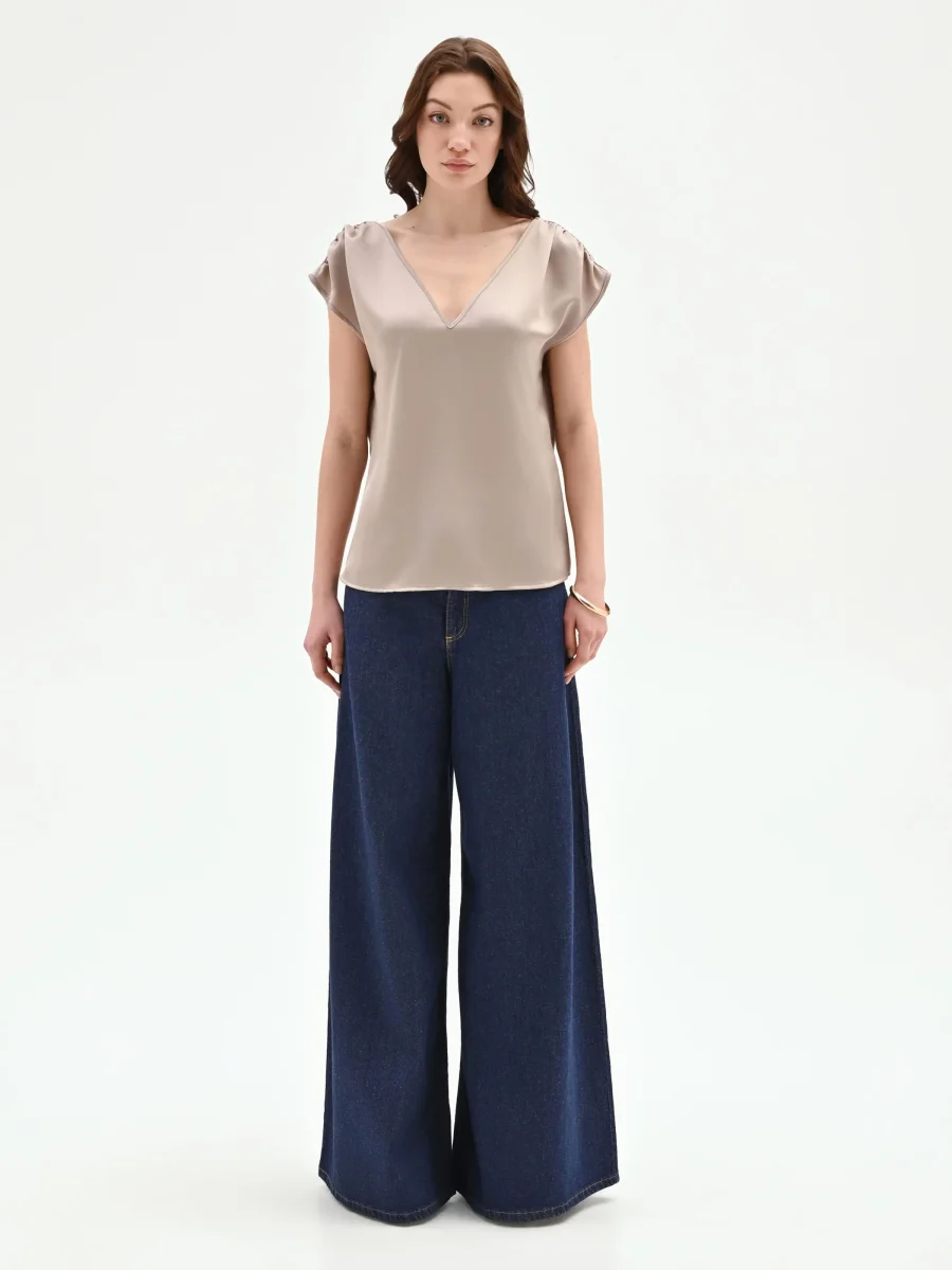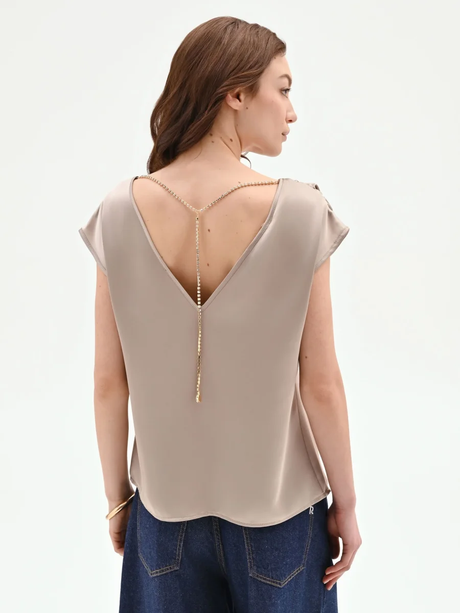 Un gioco di luce e fluidità definisce il top color tortora beige, un capo essenziale pensato per interpretare con eleganza la quotidianità.
