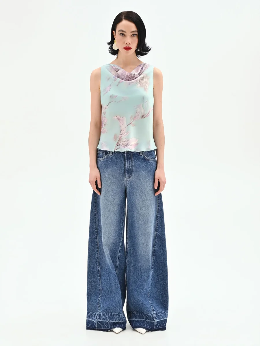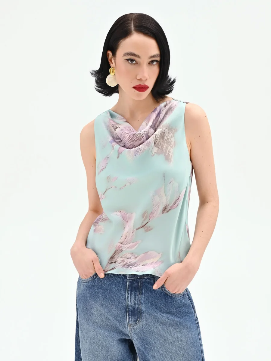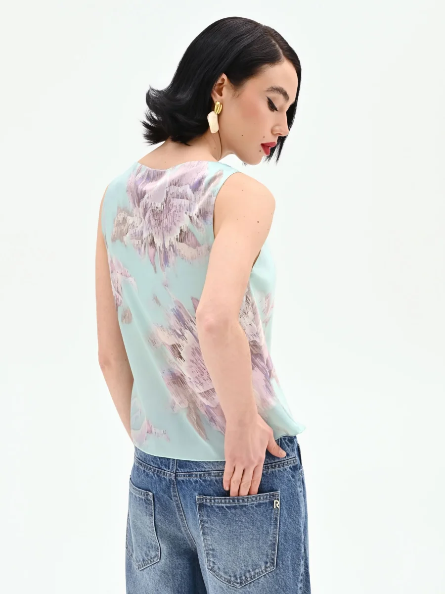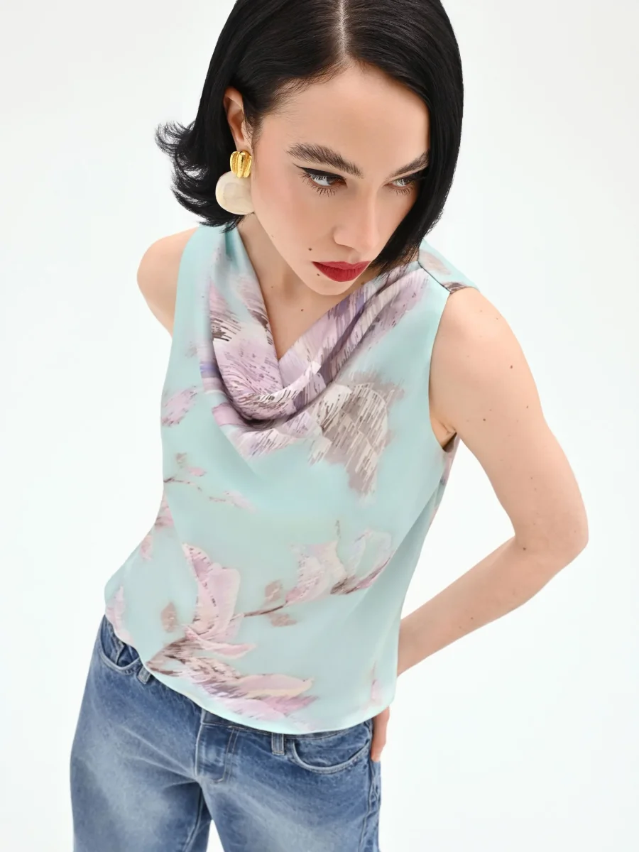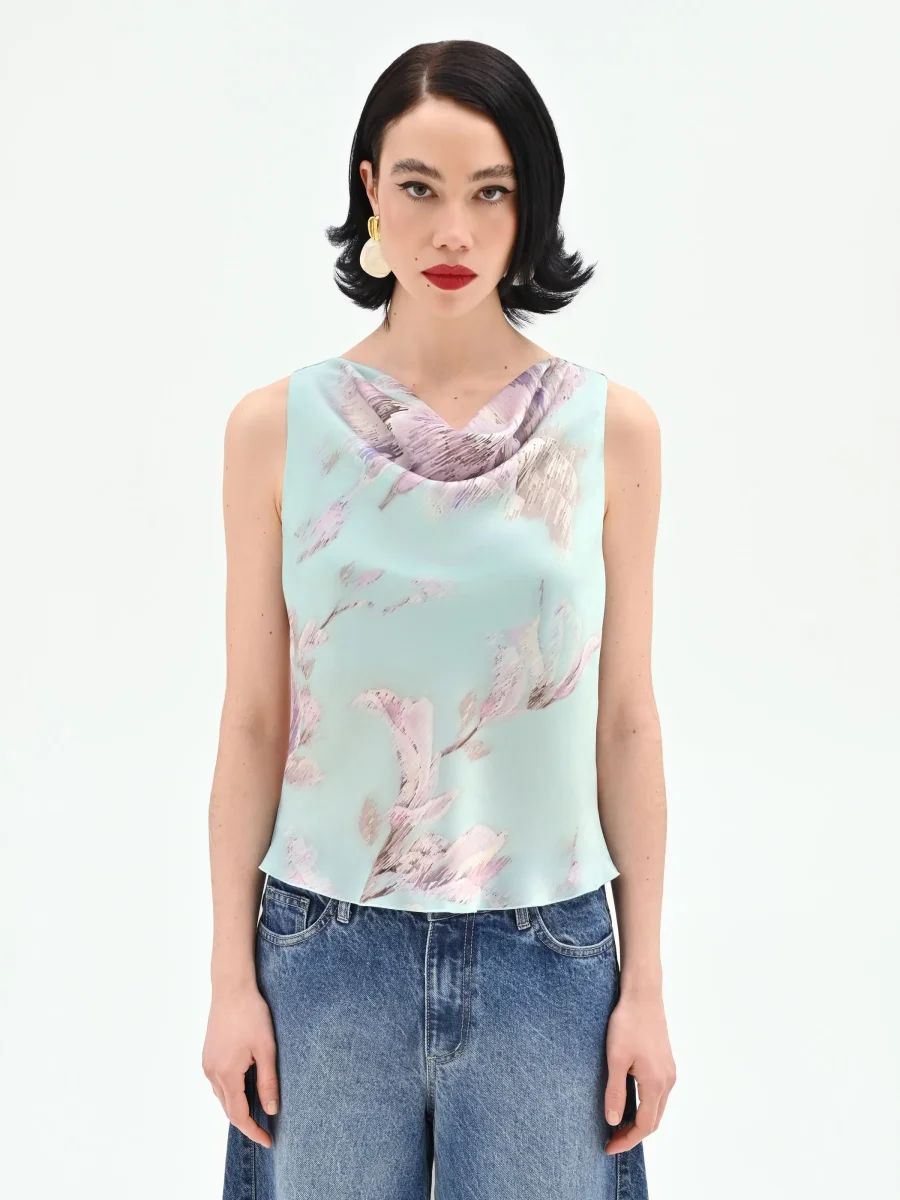 Realizzato in raso stampato, il modello è caratterizzato da un elegante scollo ad anello che disegna un morbido drappeggio sul décolleté. La silhouette dritta e fluida assicura una vestibilità confortevole, ideale per essere indossato con facilità. Sullo sfondo verde menta, i fiori nei toni del lilla e del rosa antico creano un contrasto cromatico raffinato, impreziosito da una finitura leggermente lucida che cattura la luce ad ogni movimento.