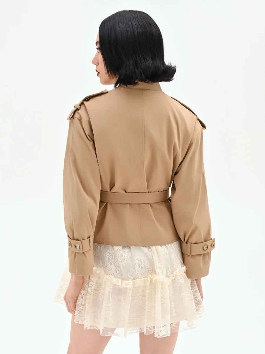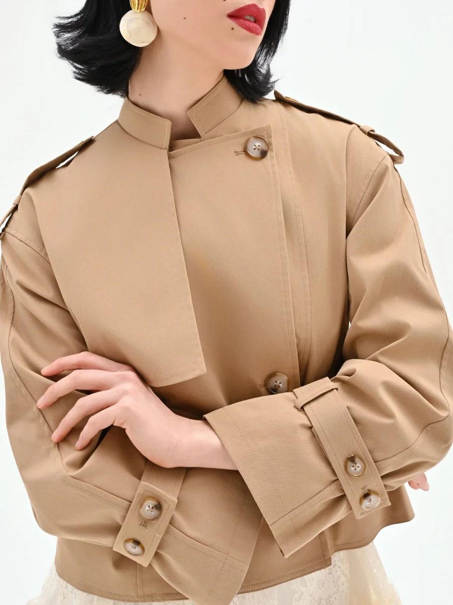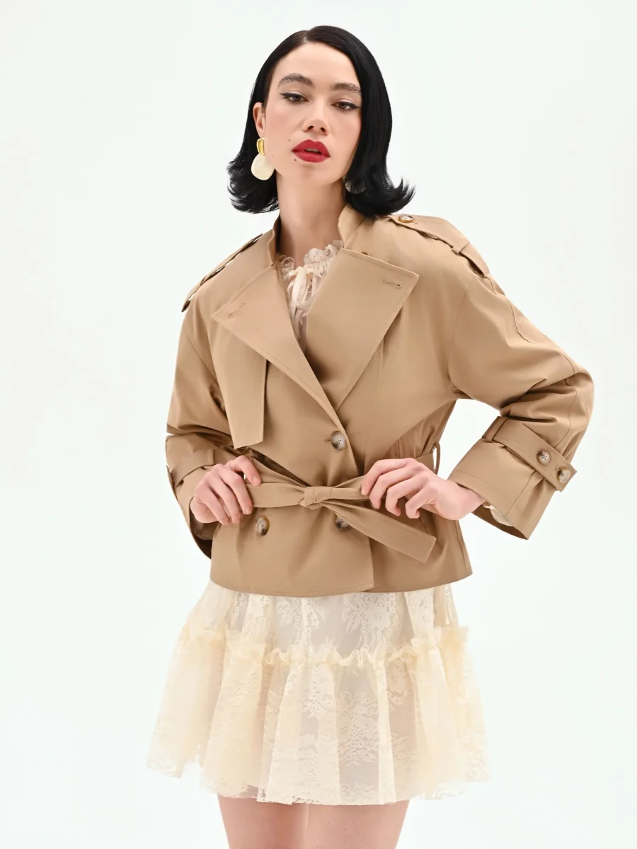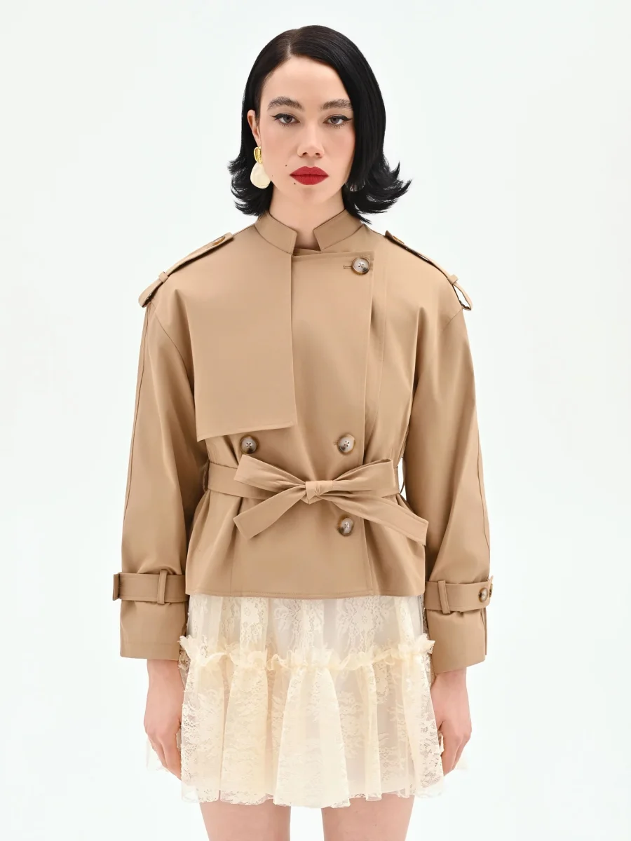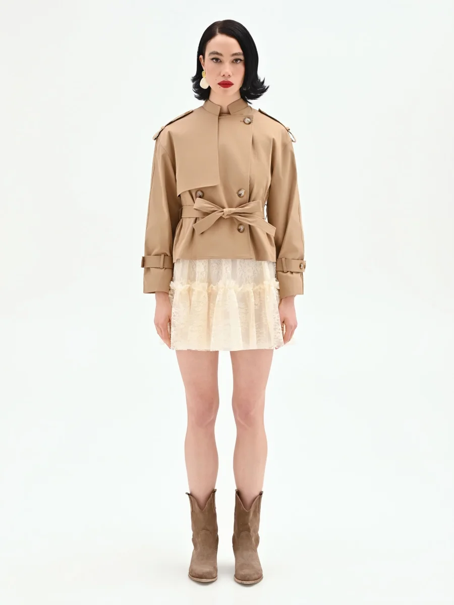 Il trench corto over beige reinterpreta un classico del guardaroba con volumi contemporanei e una vestibilità attuale, ideale per la mezza stagione.