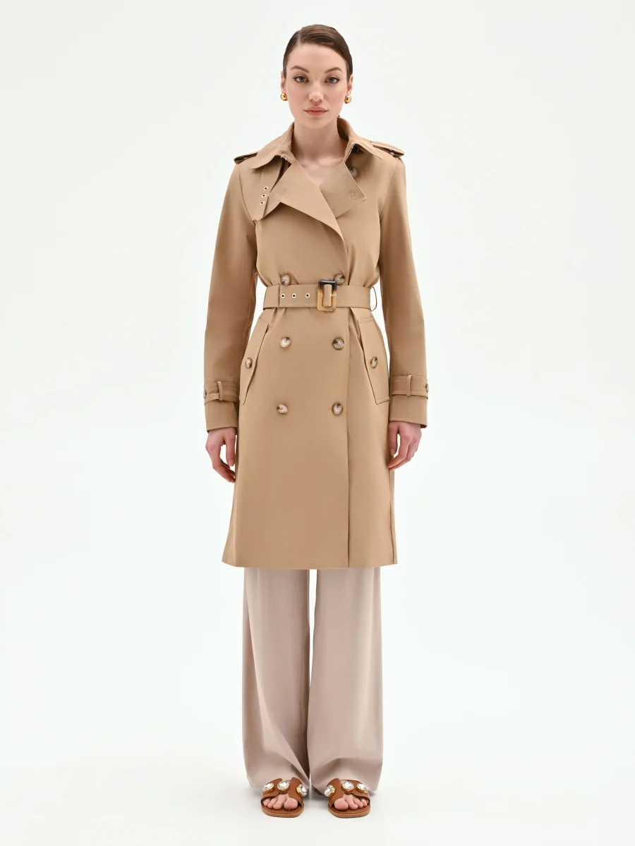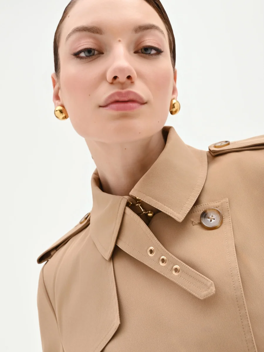 Un classico intramontabile che attraversa le stagioni, il trench doppiopetto beige è il capospalla che unisce funzionalità e stile in un equilibrio perfetto. La sua linea, pulita e strutturata, lo rende un alleato indispensabile del guardaroba quotidiano, dalla primavera all’autunno. Il capo presenta un design curato in ogni dettaglio: il collo a rever classico si abbina alle mostrine con bottone sulle spalle, elementi che ne richiamano l’origine iconica. La chiusura doppiopetto con bottoni effetto tartarugato e la cintura abbinata con fibbia rettangolare permettono di definire la silhouette, stringendola elegantemente in vita. Completano il modello le maniche lunghe con cinturini regolabili ai polsi e le due discrete tasche a filetto. Capo essenziale e versatile, si abbina con naturalezza a ogni look: perfetto sopra un abito a tubino per l’ufficio, ideale con jeans e blusa per il tempo libero. Un passe-partout che aggiunge un tocco di raffinatezza disinvolta a qualsiasi outfit, confermando il suo status di capo irrinunciabile.