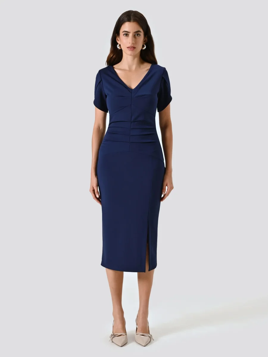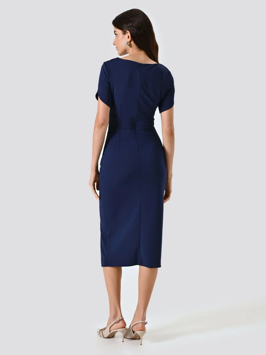 Il Tubino con Pieghe Cucite effetto Drappeggio è un abito femminile e raffinato, ideale per valorizzare la silhouette con eleganza in ogni momento della giornata.