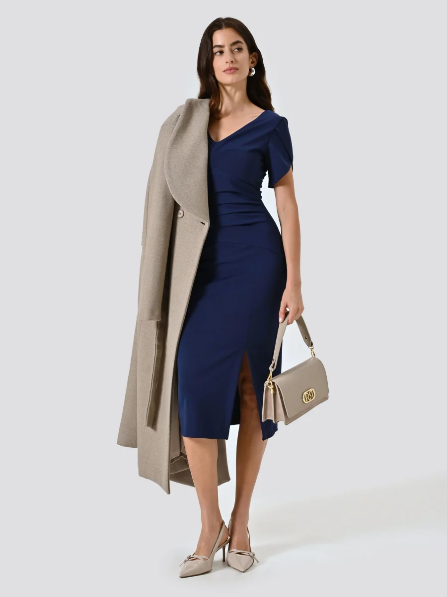 Il Tubino con Pieghe Cucite effetto Drappeggio è realizzato in punto Milano con tessuto parzialmente riciclato e presenta una linea midi aderente, pieghe cucite sul davanti che disegnano un effetto drappeggio, scollo a V e maniche sormontate. La chiusura con zip posteriore consente una vestibilità pratica e confortevole.