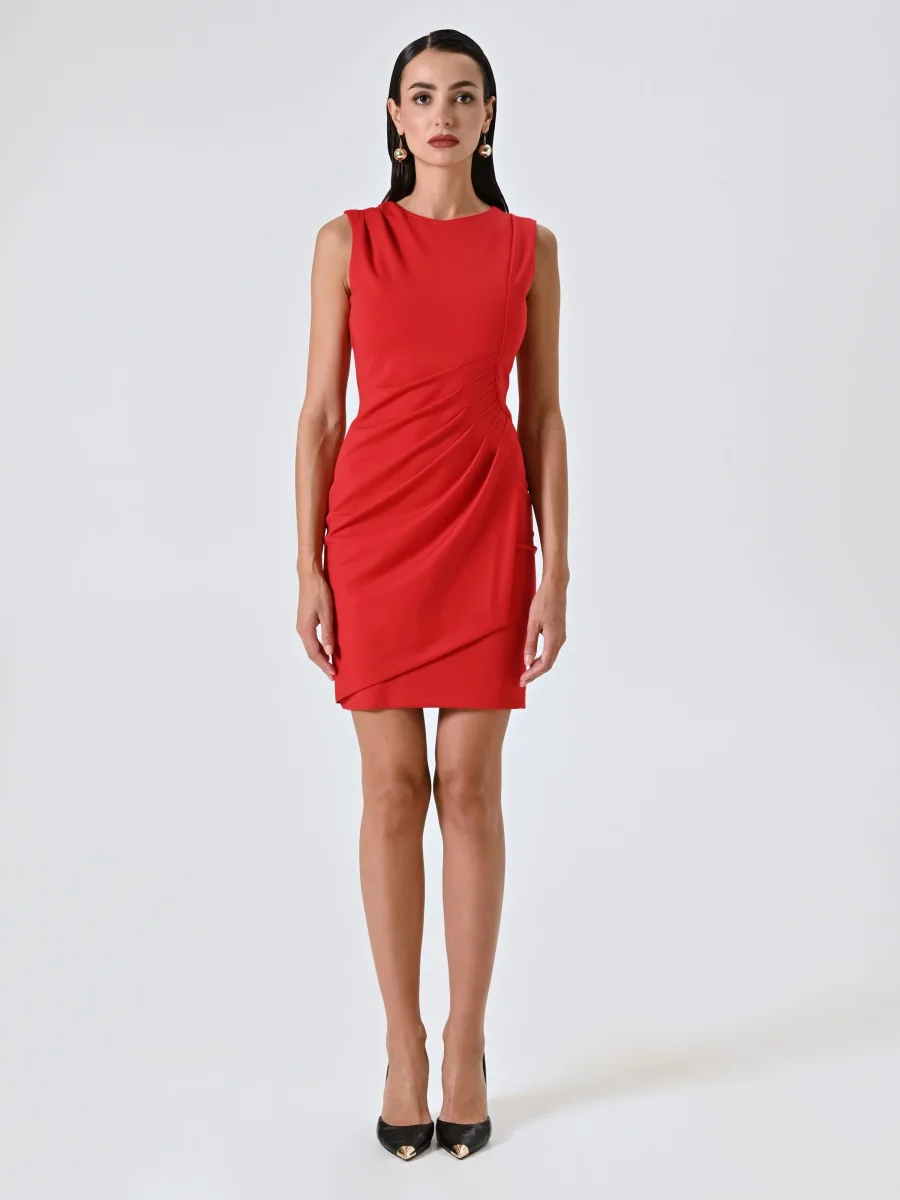 Realizzato in jersey punto Milano, il Tubino con Drappeggio e Gonna Portafoglio è caratterizzato da una costruzione smanicata, un elegante drappeggio che valorizza il busto e una gonna a portafoglio sormontata che accompagna con fluidità i movimenti. La chiusura con zip posteriore garantisce una vestibilità confortevole e pulita.