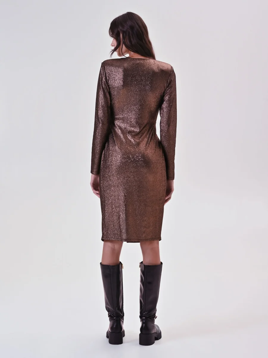 Il Tubino Drappeggiato in Maglia Laminata Bronzo è un abito luminoso e sensuale, ideale per catturare l’attenzione durante le occasioni speciali.