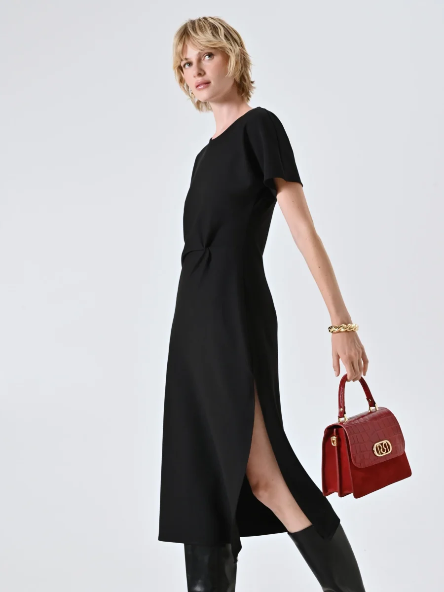 Realizzato in jersey punto Milano, il Tubino Nero in Punto Milano con Nodo presenta maniche corte, un raffinato nodo laterale che valorizza il punto vita e uno spacchetto che dona movimento alla silhouette. La chiusura è affidata a un bottone discreto sul retro, per un finish pulito e curato.