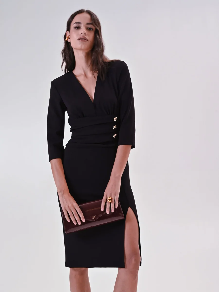Il Tubino Nero con Banda Drappeggiata e Bottoni Design si completa con calzature ed accessori di collezione e, per un fit impeccabile, con la collezione Lingerie Rinascimento. Perfetto per occasioni speciali, rappresenta una scelta di qualità che unisce comfort e stile, distinguendosi da alternative meno curate grazie alla combinazione di tessuto sostenibile e dettagli ricercati.